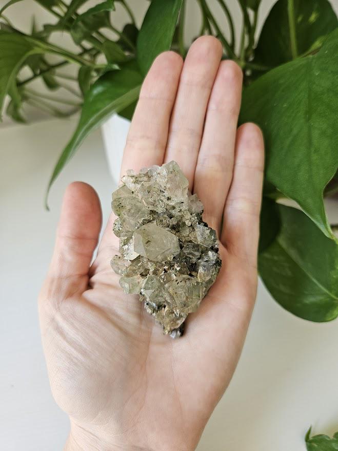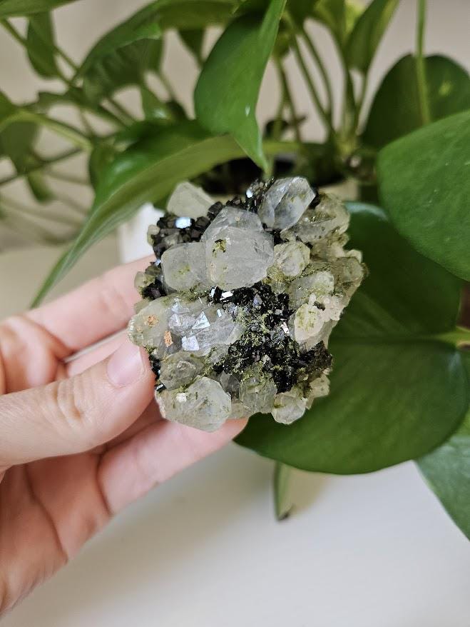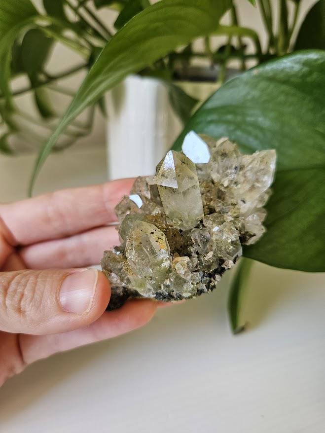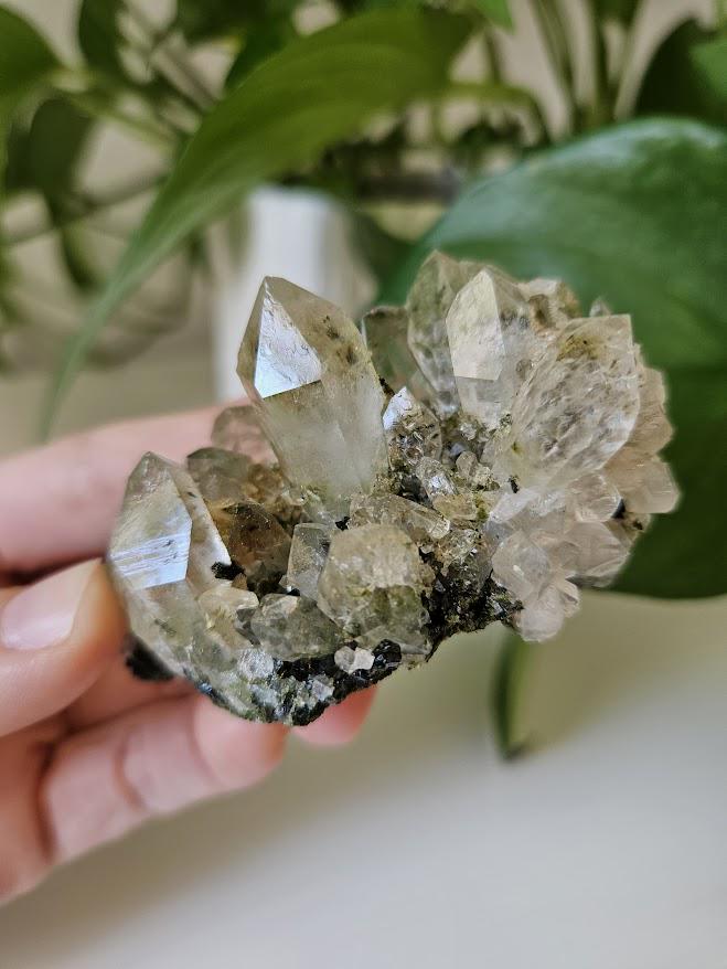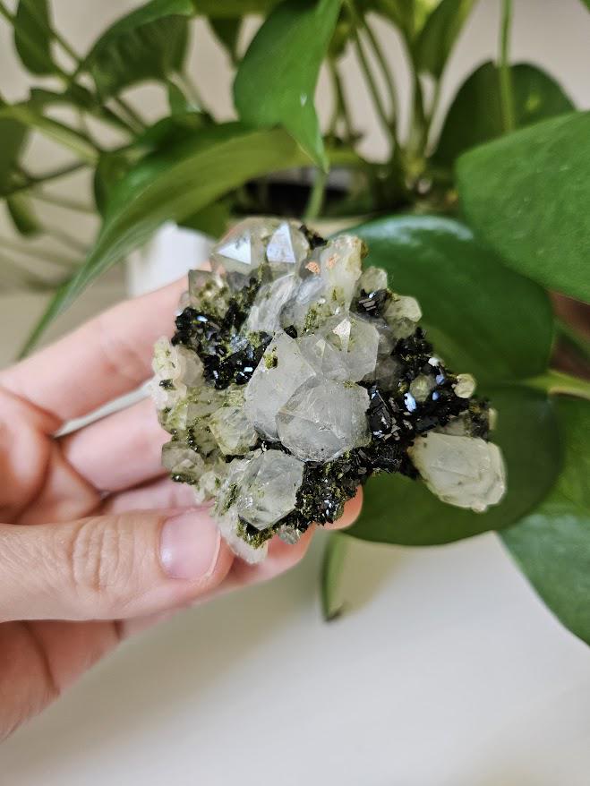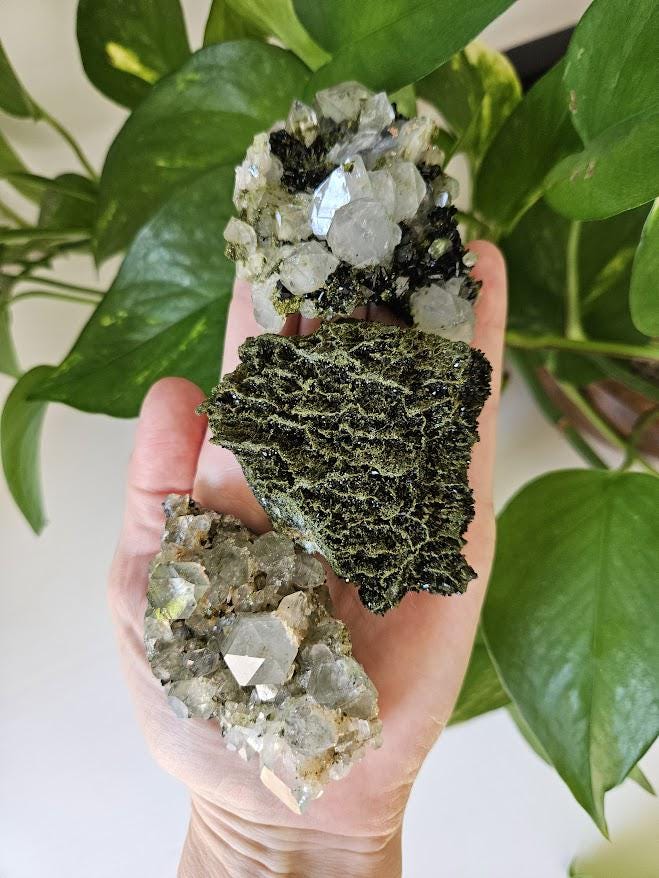 This is a charming set of 3 small Epidote and Quartz clusters from Hakkari, Turkey — a region known for producing beautiful and energetically vibrant stones. Each cluster is a unique mix of shimmering quartz points and/or green epidote, naturally formed together in perfect harmony. I just love this lot because it has a nice variation of different forest quartz specimens.