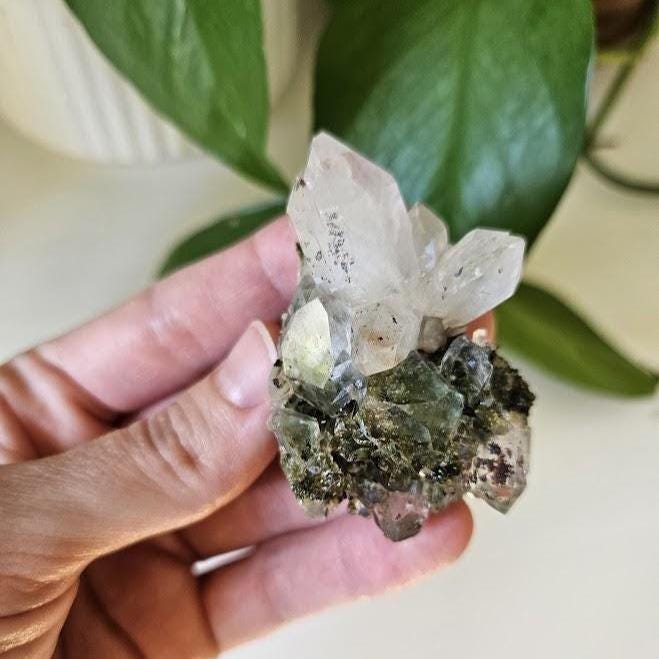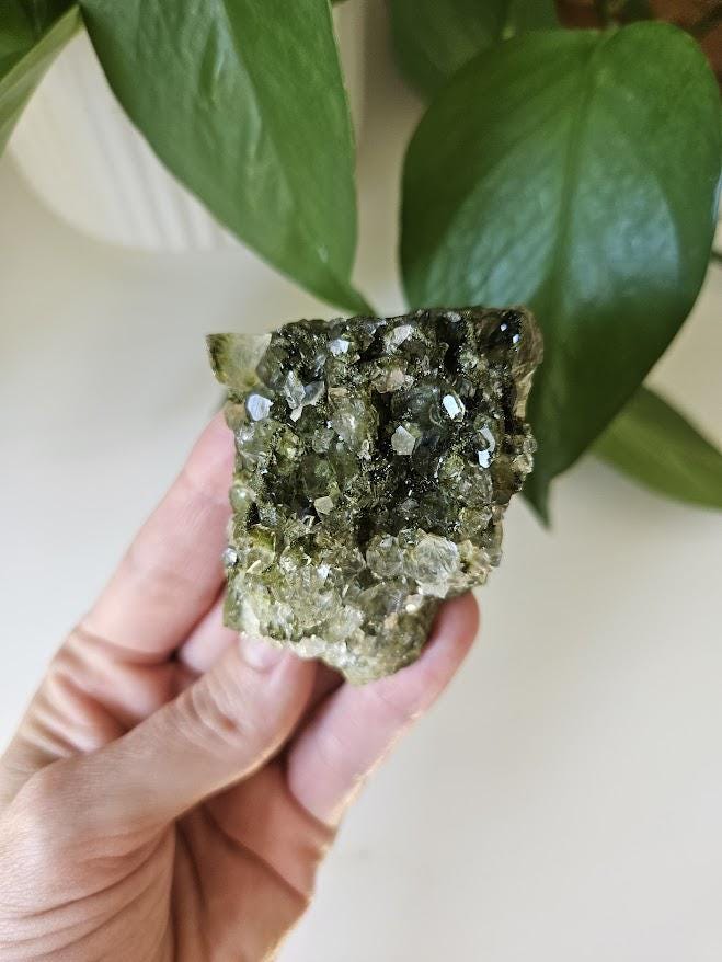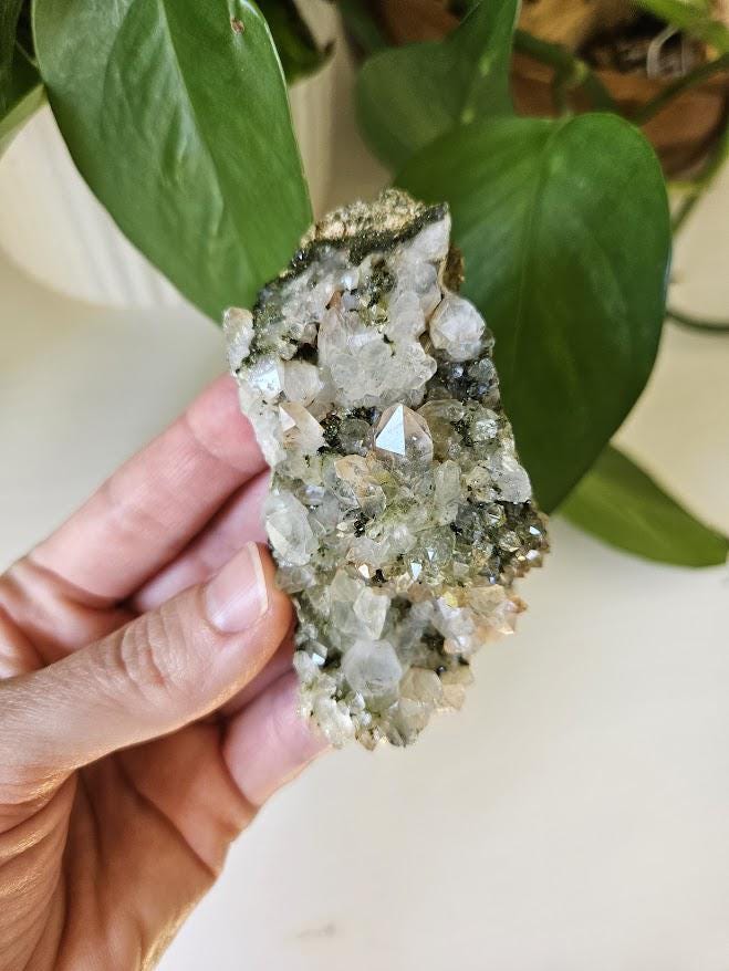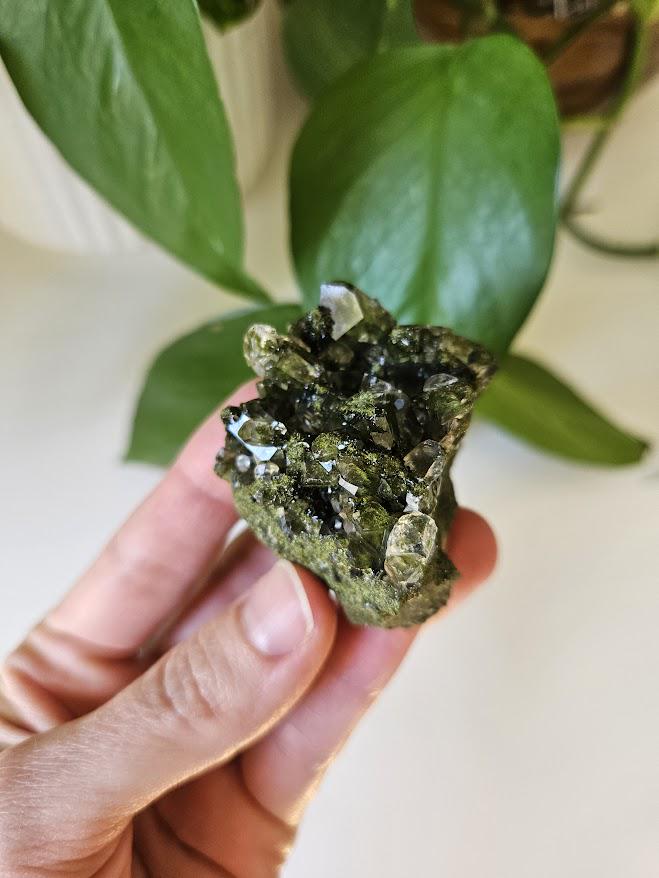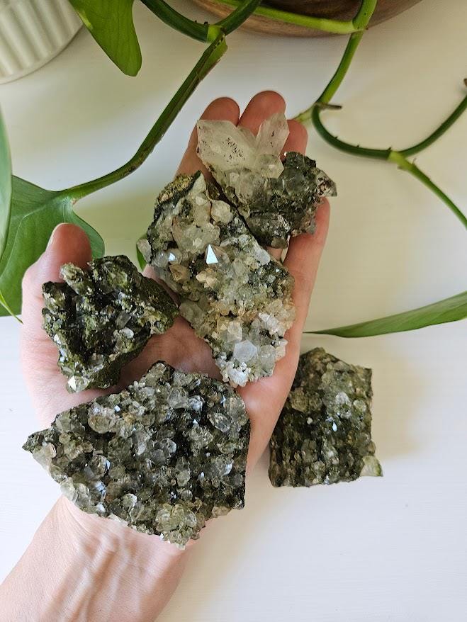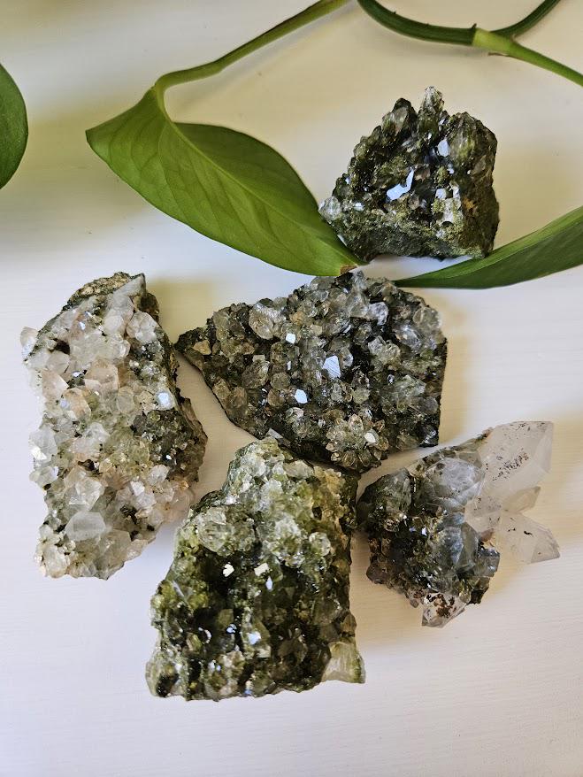 This is a charming set of 5 small Epidote and Quartz clusters from Hakkari, Turkey — a region known for producing beautiful and energetically vibrant stones. Each cluster is a unique mix of shimmering quartz points and green epidote, naturally formed together in perfect harmony. I just love this lot because it has a nice variation of different forest quartz specimens.