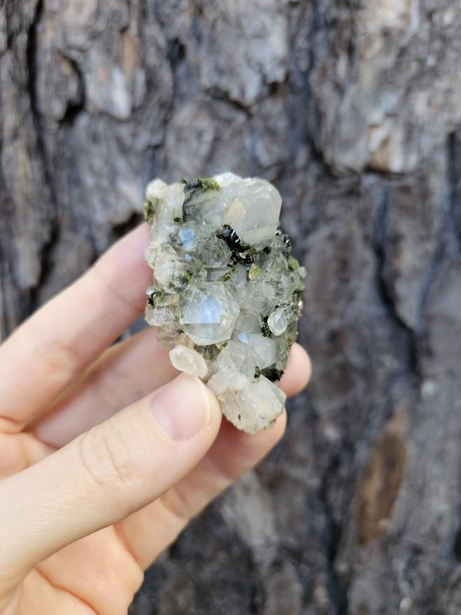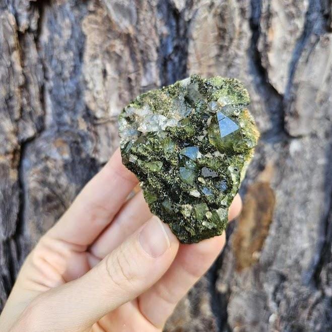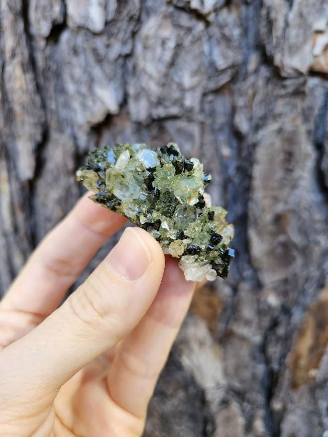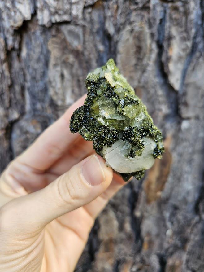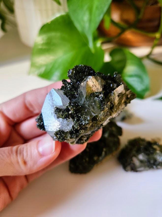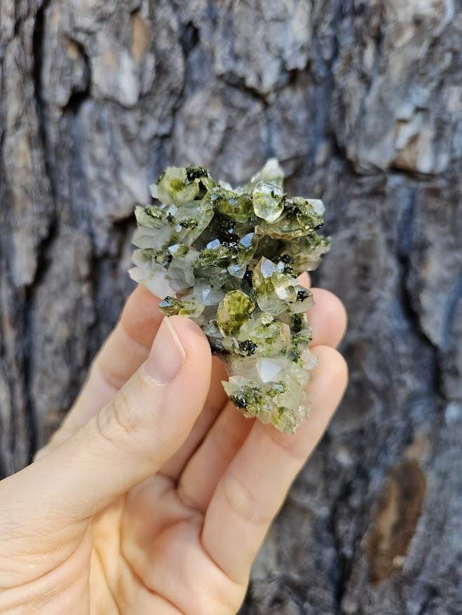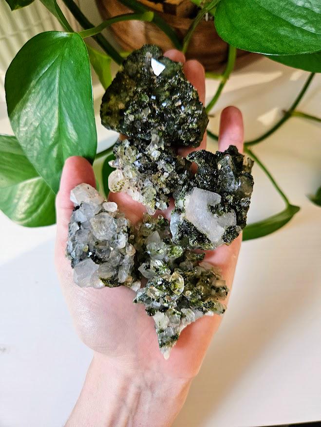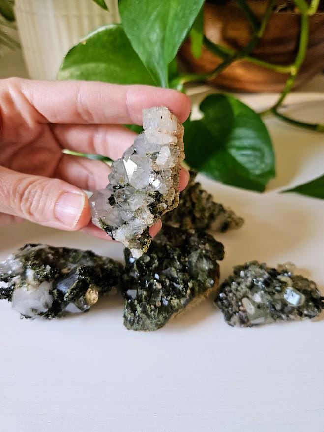 This is a charming set of 5 small Epidote and Quartz clusters from Hakkari, Turkey — a region known for producing beautiful and energetically vibrant stones. Each cluster is a unique mix of shimmering quartz points and green epidote, naturally formed together in perfect harmony. I just love this lot because it has a nice variation of different forest quartz specimens.