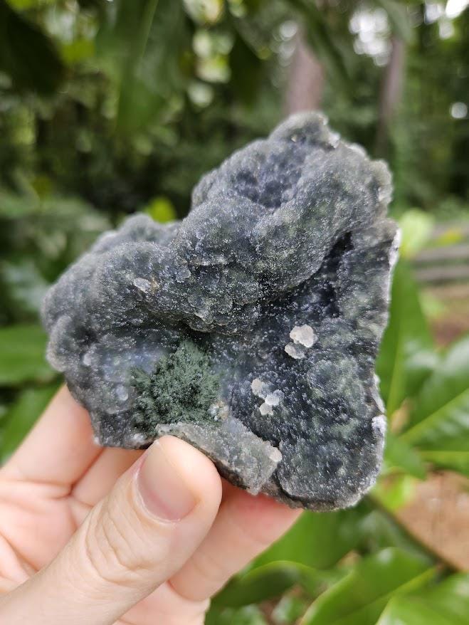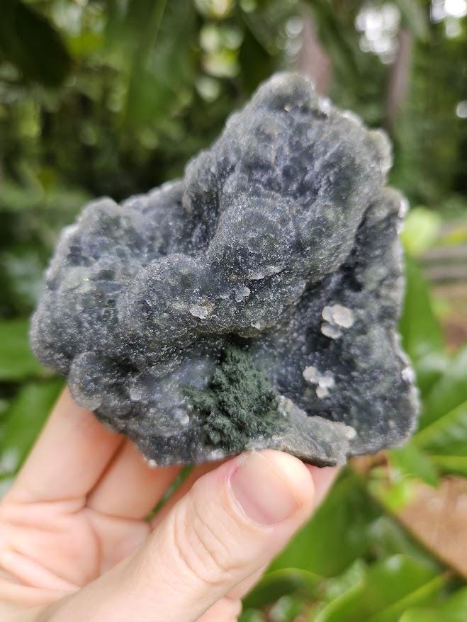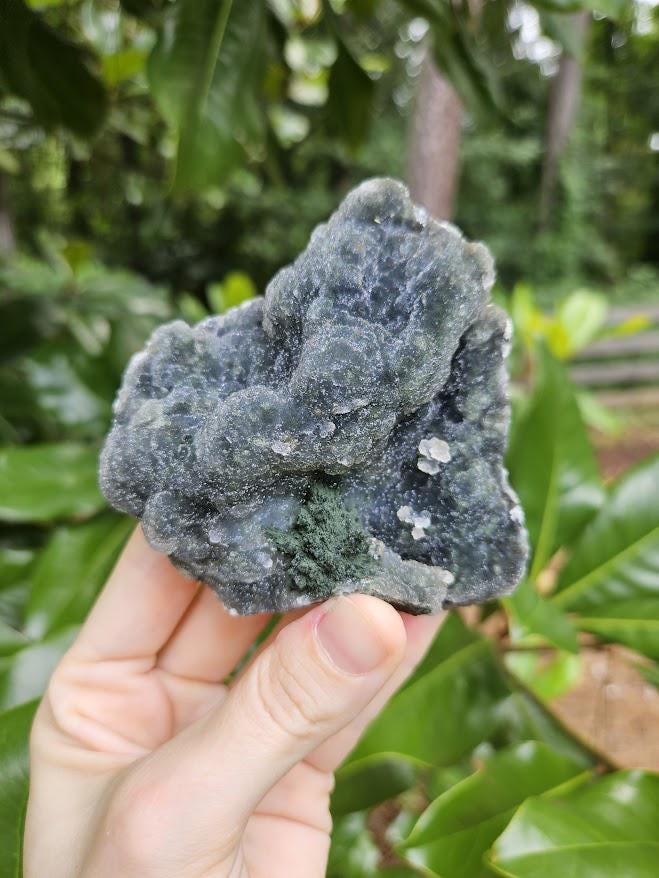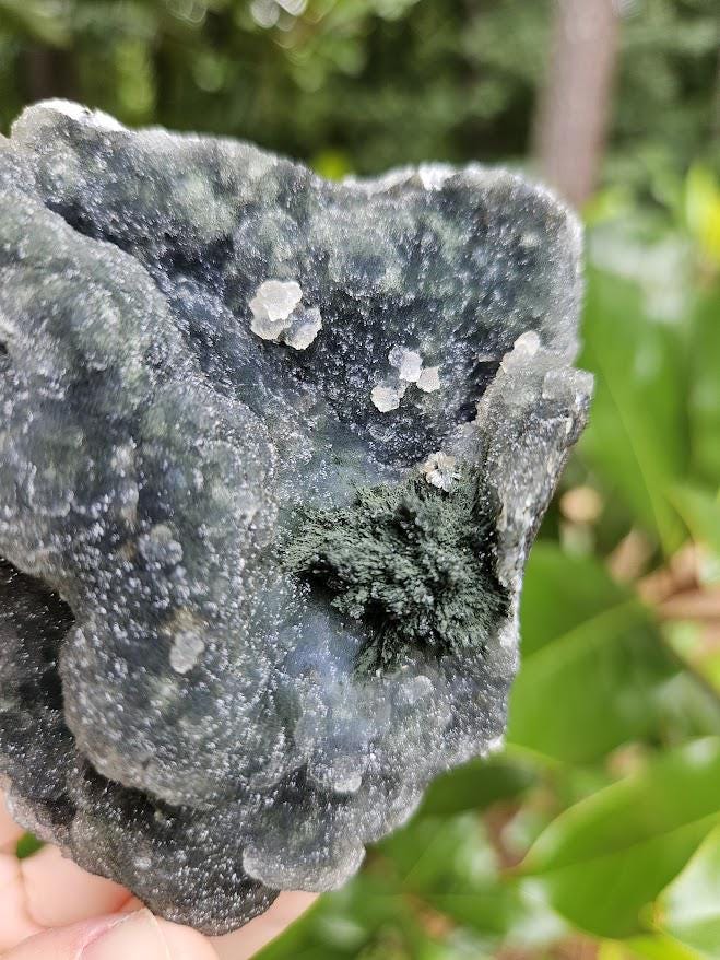 This is a gorgeous blue chalcedony cluster from Nasik, India! It has a stunning, natural grayish blue yet bluish green coloring throughout and such a neat appearance and texture! Blue chalcedony is rarely found and is wonderful to come by! The sparkle under bright light is so pretty! I also love the touch of green julgoldite. 🙂