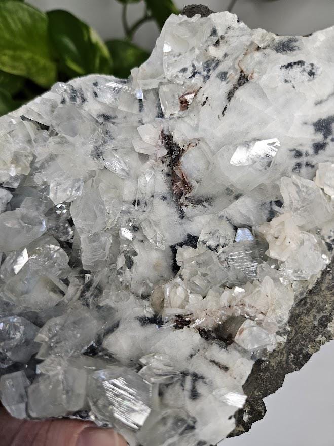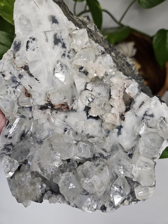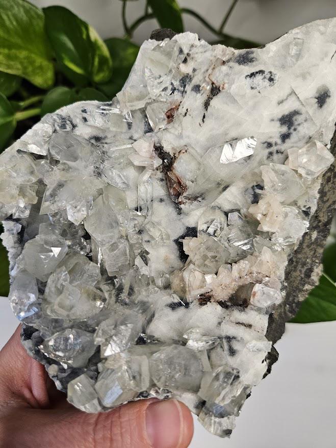 This natural specimen includes diamond apophyllite crystals on blue and white chalcedony, with soft hints of red hematite on select points. The contrast between bright apophyllite and gentle chalcedony creates a calm, well-balanced appearance. I just love the sparkle! 🙂