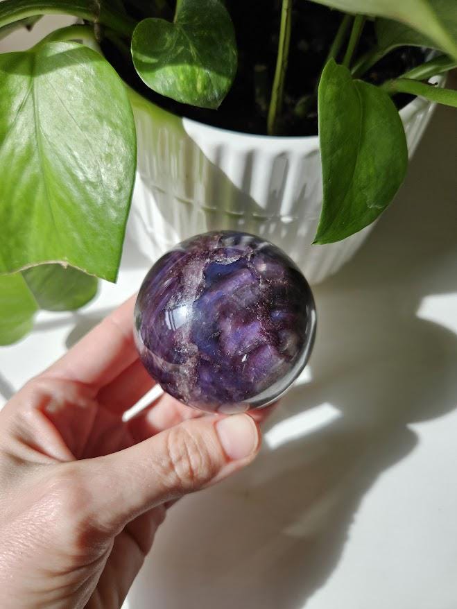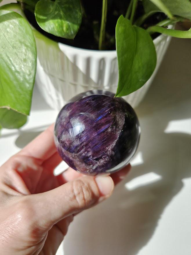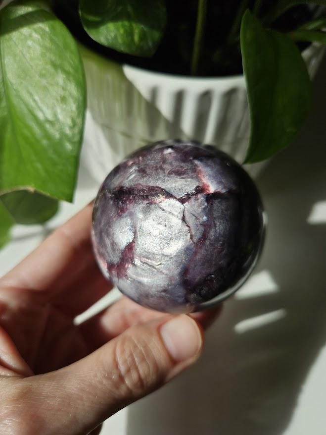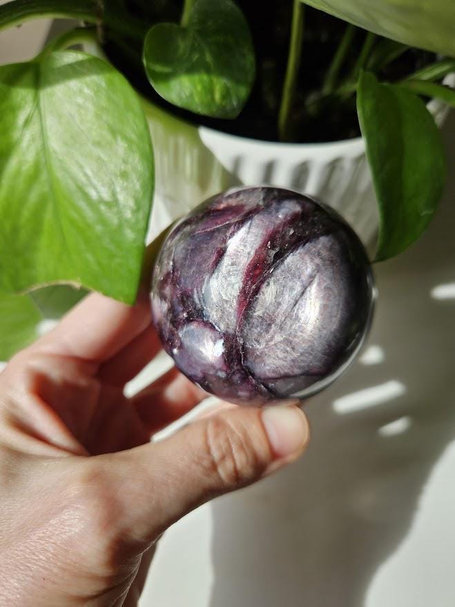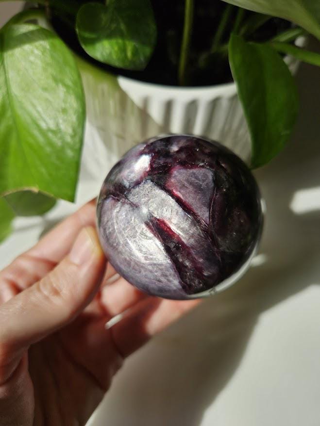 Wow! This is an incredible gemmy lepidolite sphere! I just love this piece! As you can see, it has the prettiest sheen, natural coloring, and is beautifully polished. The flash and the deep purple coloring are just gorgeous! It is rare that I have lepidolite in my shop because it can be tricky to find high-quality pieces. I am very excited to have these! 🙂