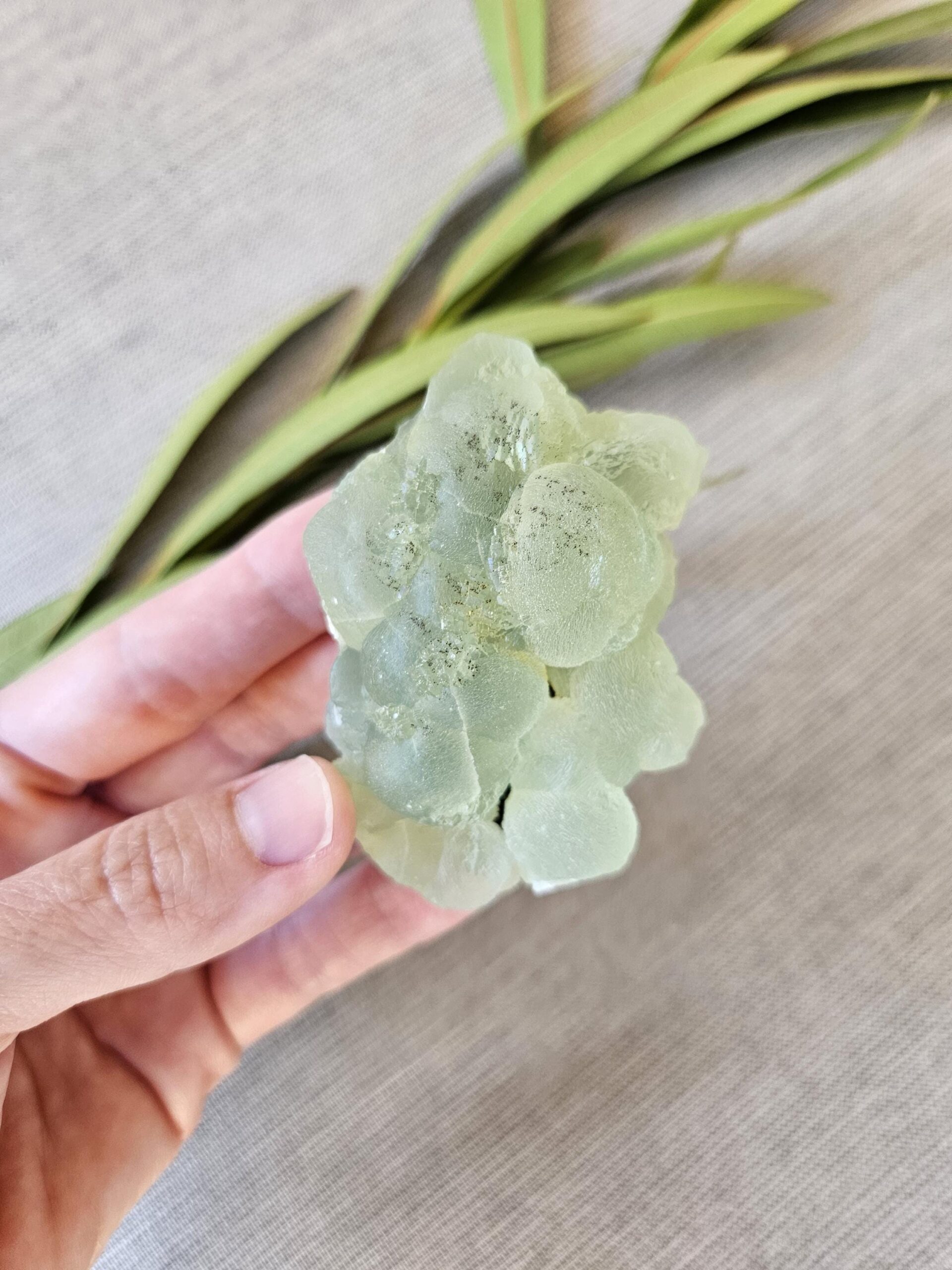 This is a lovely green prehnite crystal from Mali! The natural prehnite color, the beautiful crystalline structure, and the size are very pretty! As you can see from the pictures, this is a raw prehnite crystal. This type of prehnite crystal in particular is often known as green apple prehnite and is usually paired with epidote (some crystals along the sides and bottom).