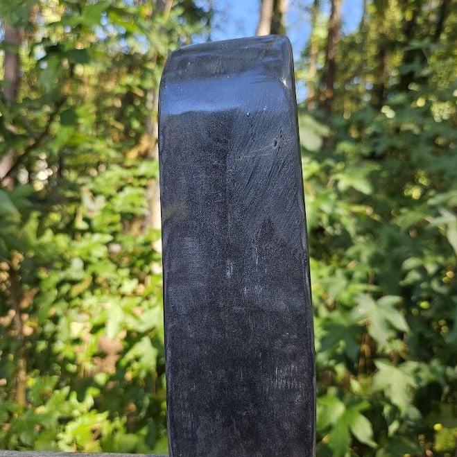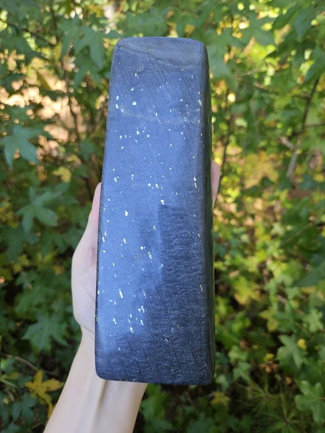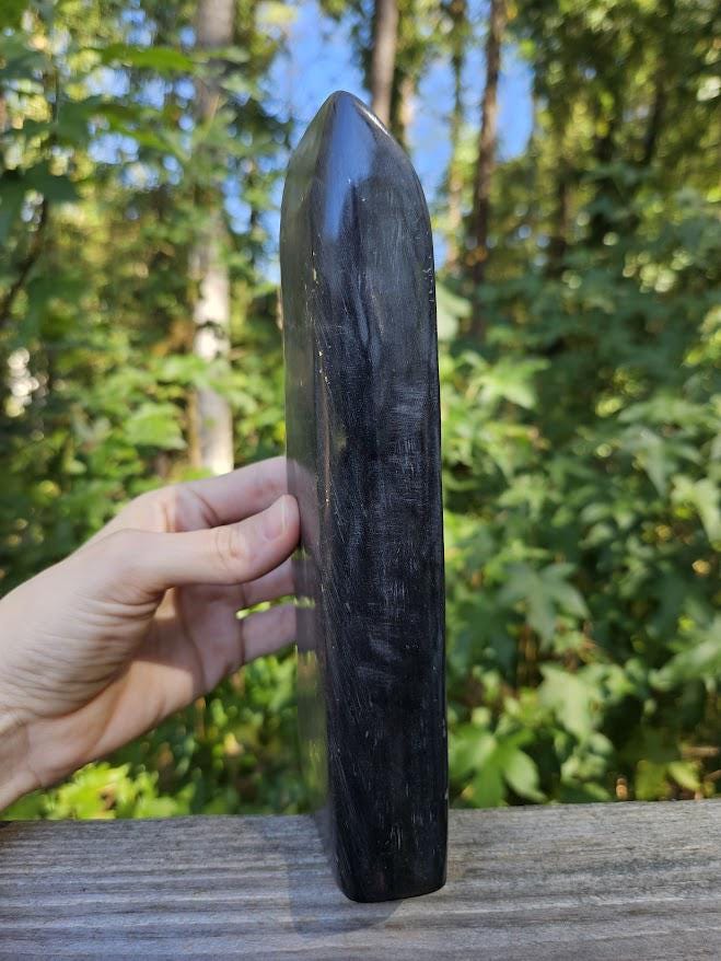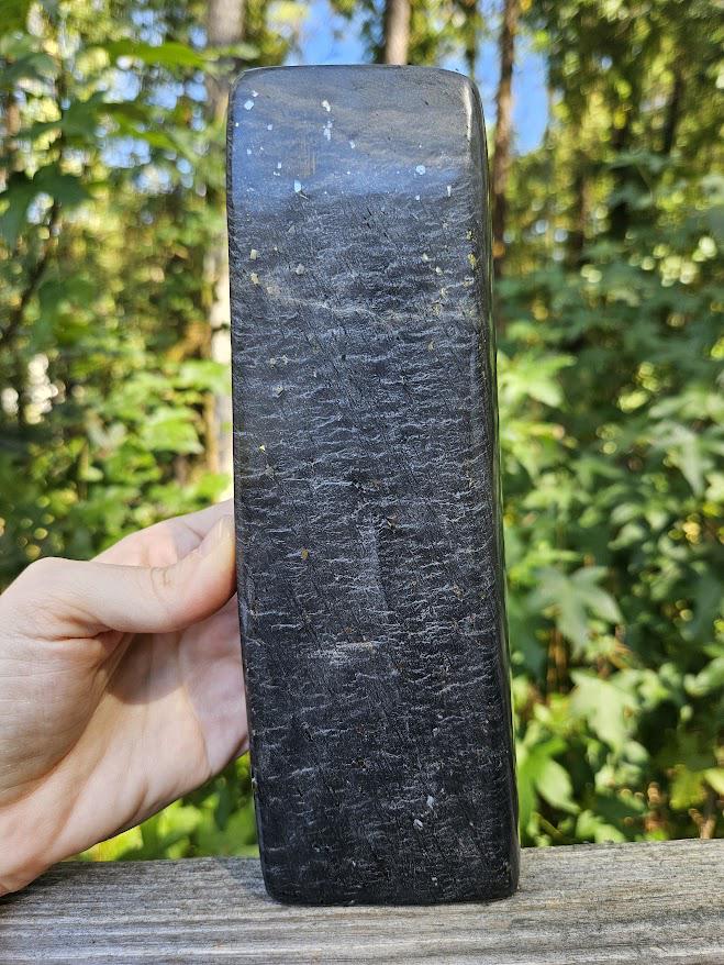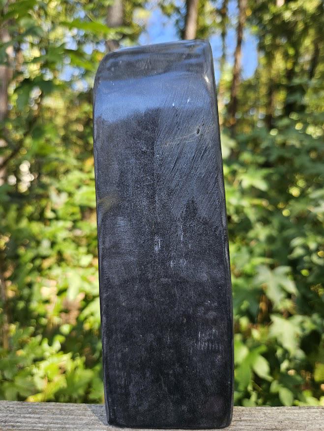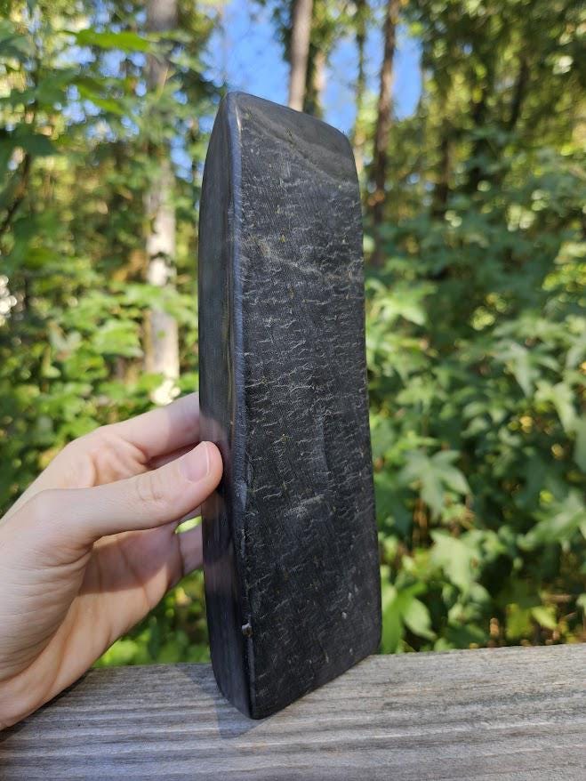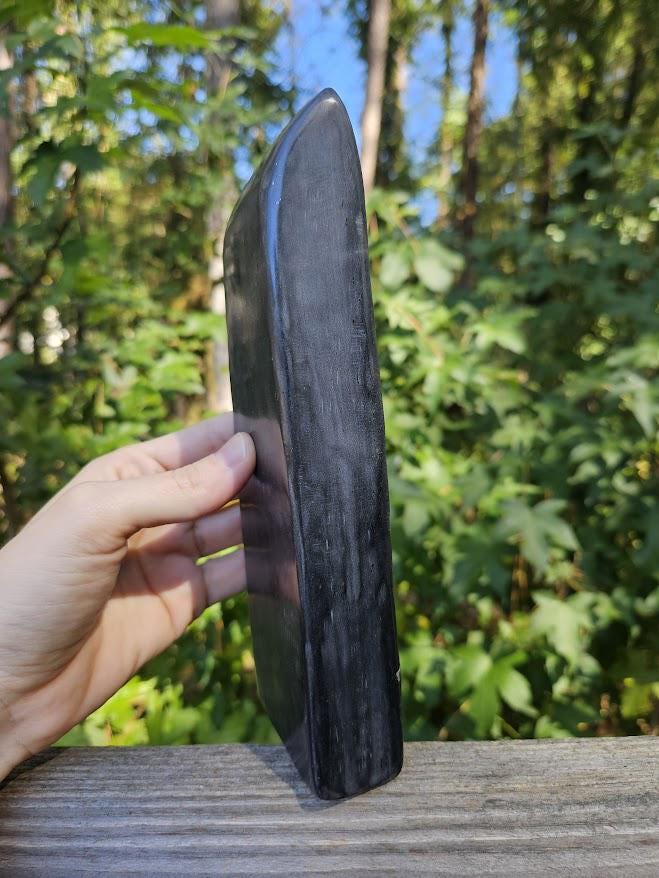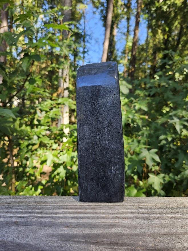 (I have never seen this before, and it is not too common. This may have differences in opinion on what it is considered, but it truly has a smooth finish like jade, and that is what my vendors and miners have classified it as.) <3 This quality, standing piece has a balanced shape and comfortable weight, making it easy to display on a shelf, desk, or altar space. Its grounding presence brings a sense of calm, stability, and quiet strength to any environment. Weight: 2 lb 3.8 oz Size: approx. 2.75" wide × 8" tall Material: Natural Black Jade with Pyrite Finish: Polished standing freeform (this piece has a thinner base) Metaphysical Properties: Black Jade is known for its grounding and protective energy. It helps clear negativity, strengthens boundaries, and supports emotional balance. Connected to the root chakra, it encourages calm focus and inner stability. This is a beautiful, natural piece for both display and energy work. 🌿 Thank you so much for visiting my shop! I am so happy to say that a portion of each sale goes straight to charity each month. Thank you for making that possible!🖤