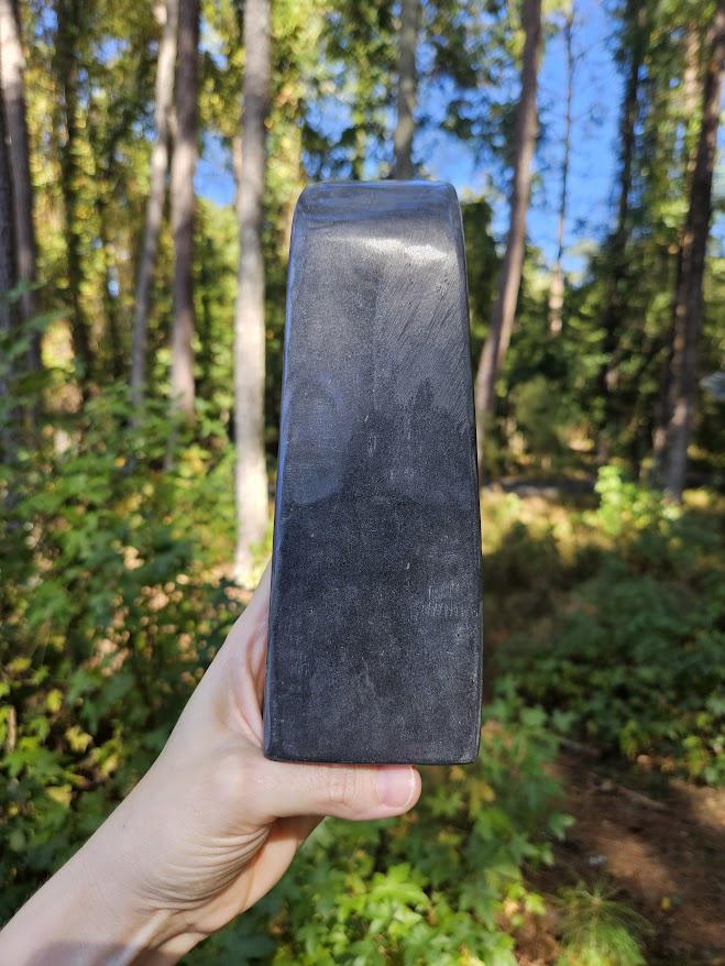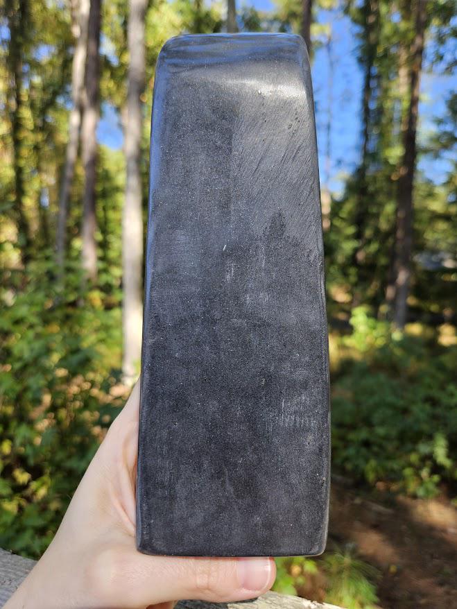 This is a gorgeous polished black jade freeform from Afghanistan. In this piece, you will also see specks of pyrite. It is such a beautiful piece – so smooth and nicely polished! I just love it! Though it is considered black jade, it has earthy gray undertones and appears more of a dark gray.