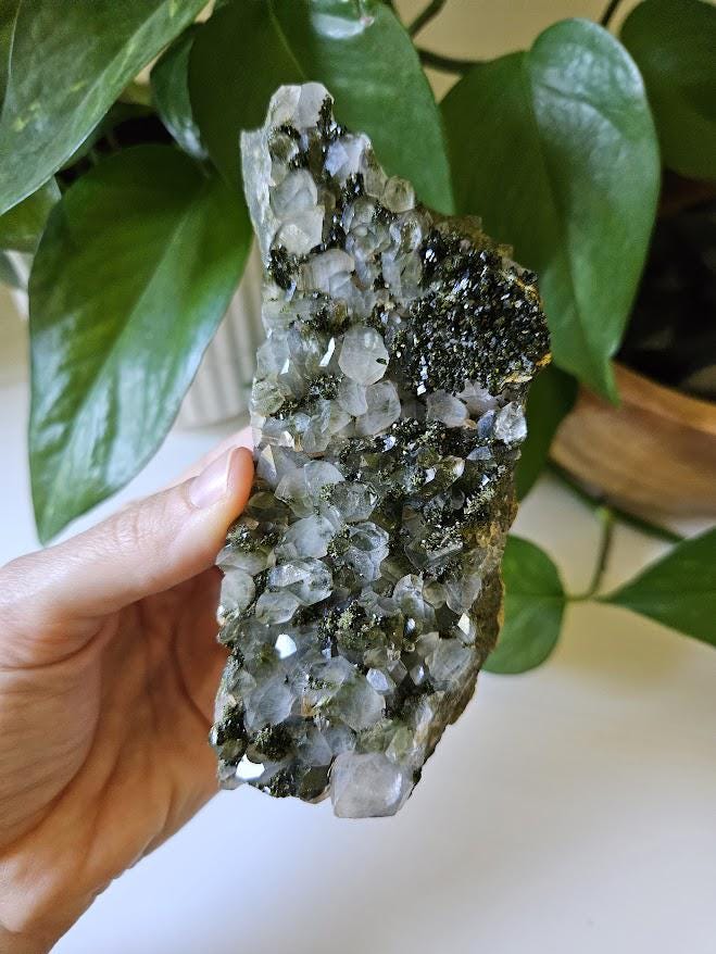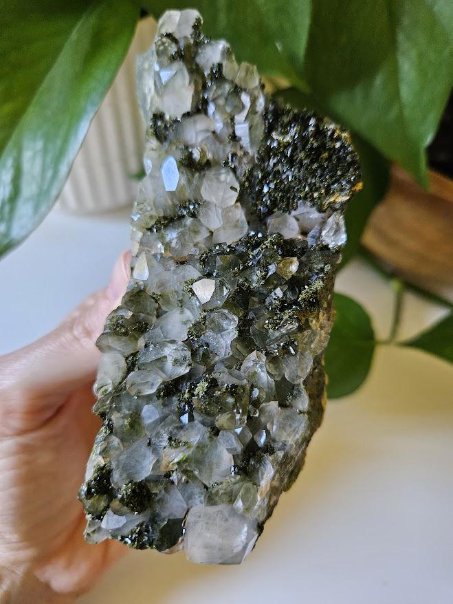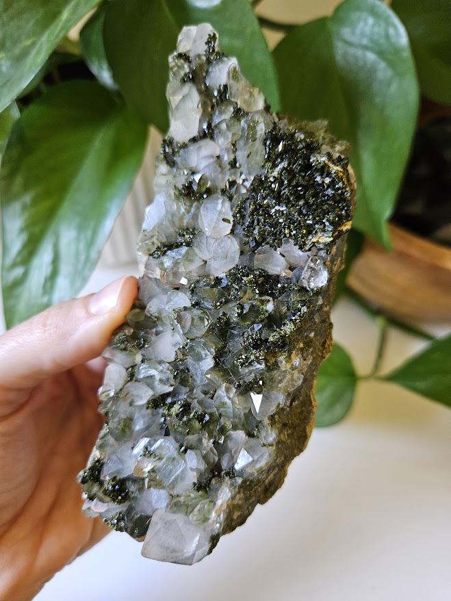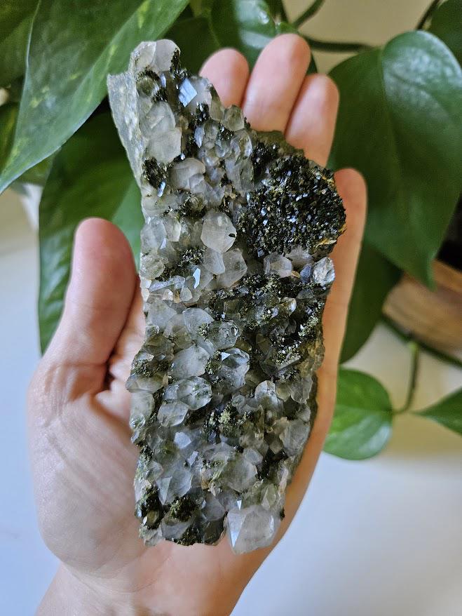 This is a beautiful, all-natural forest quartz crystal from Hakkari, Turkey! It features both epidote and clear quartz in a stunning natural formation. These crystals are often referred to as fairy forest quartz or forest quartz. The combination of the two crystals is very pretty! This piece, in particular, has beautiful depth inside some of the crystals.