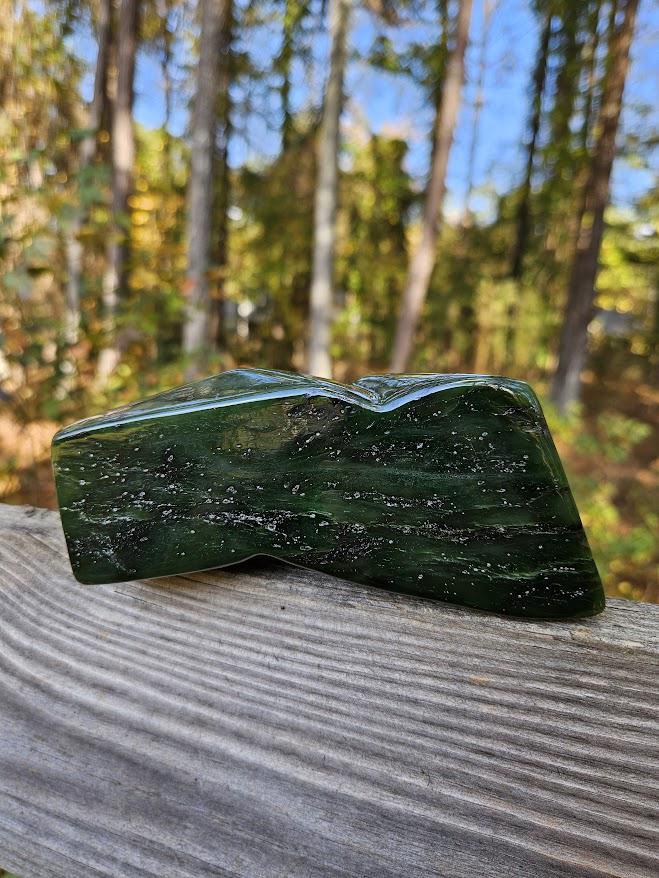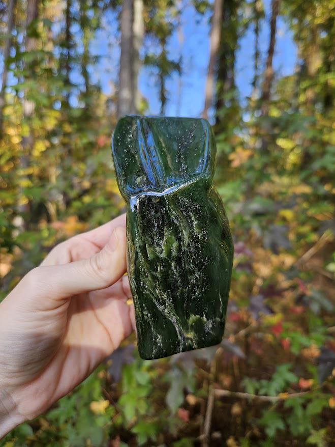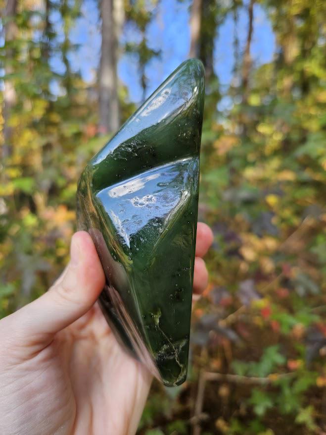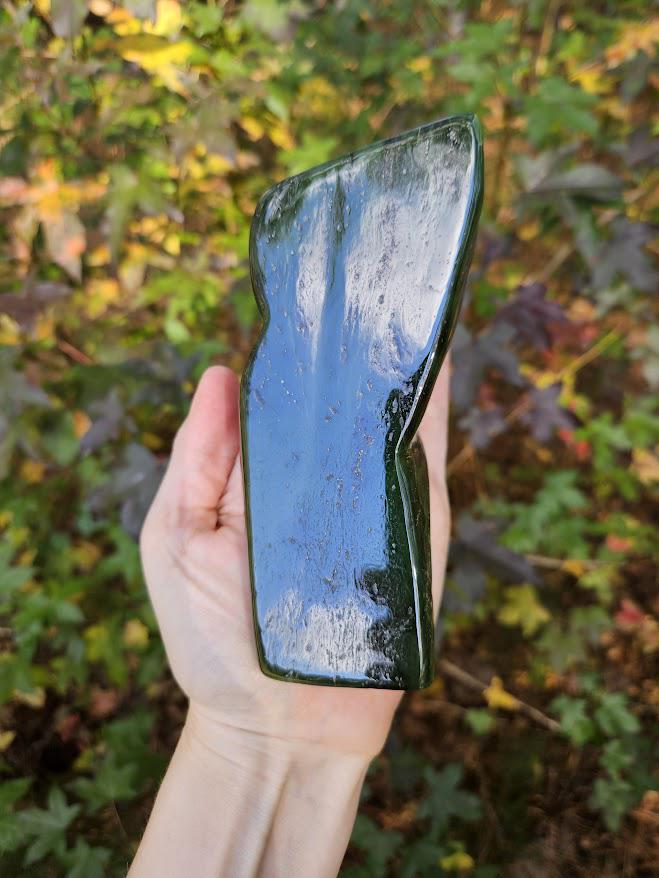 This is a beautiful Nephrite Jade freeform from Afghanistan! It displays a beautiful natural green hue and a polished surface that highlights its rich, earthy energy.