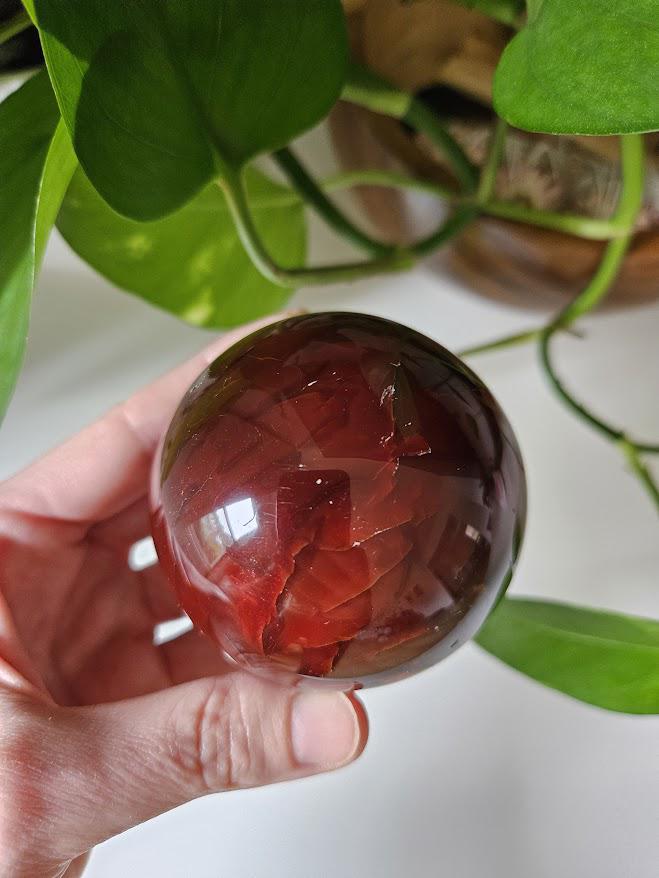 This is a beautiful polished carnelian sphere from Madagascar! I just love the coloring and the natural carnelian markings! It is such a nice solid piece and is a good size to hold. The rich/dark red coloring is so pretty! 🙂