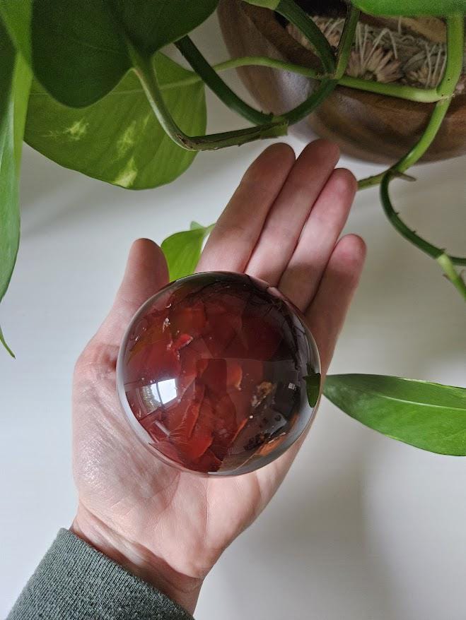 This beautiful carnelian sphere, or what some people refer to as the crystal for creativity or the vitality crystal, would make a great gift for someone, a lovely addition to a crystal collection, or would be a very pretty home decor crystal! <3 This red carnelian sphere measures: Weight: 13.6 ounces Width and height: about 2.5 inches *As always, please review the measurements carefully! :) **Please know that like many crystals and stones, this piece does have natural markings, lines, and some chips. Please also know that it is a bit darker than the pictures show. The carnelian sphere you see in the pictures is the carnelian you will receive. Thank you so much for visiting my shop! <3