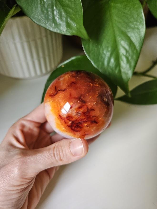 This beautiful carnelian sphere, or what some people refer to as the crystal for creativity or the vitality crystal, would make a great gift for someone, a lovely addition to a crystal collection, or would be a very pretty home decor crystal! <3 This red carnelian sphere measures: Weight: 12.1 ounces Width and height: about 2.25 inches *As always, please review the measurements carefully! :) **Please know that like many crystals and stones, this piece does have natural markings, lines, and some chips. The carnelian sphere you see in the pictures is the carnelian you will receive. Thank you so much for visiting my shop! <3