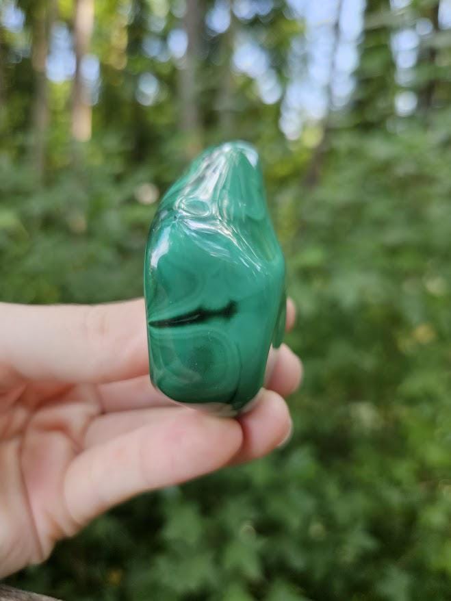 This is a beautiful green malachite stone from Congo! This small, polished malachite freeform has such a unique color that I was drawn to right away! It has this gorgeous, minty green color that I don’t see very often. I just love all the beautiful details and markings throughout!