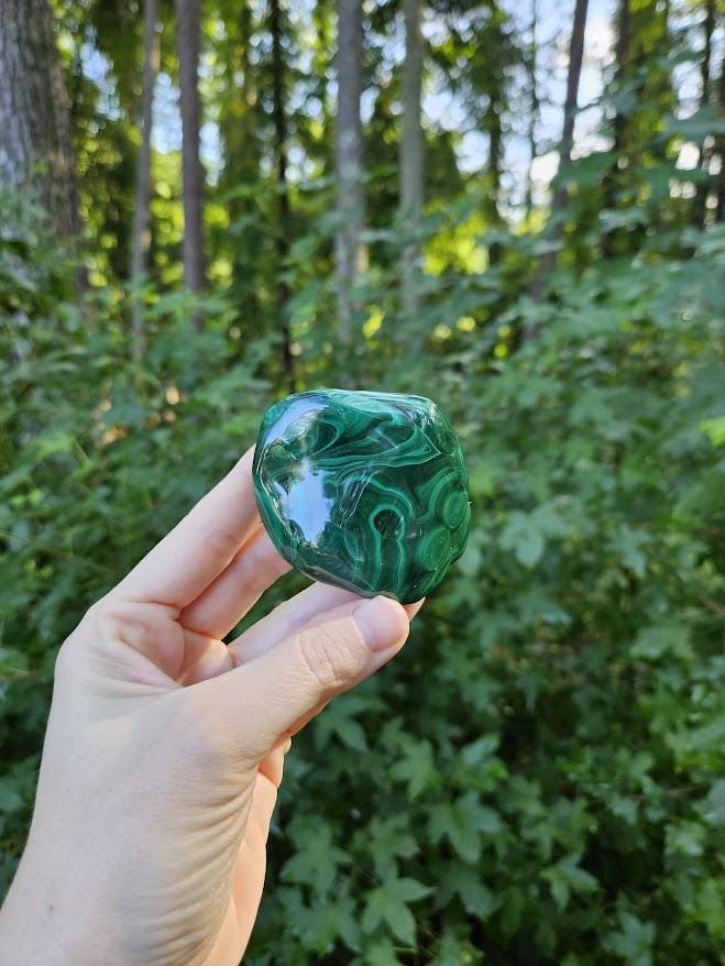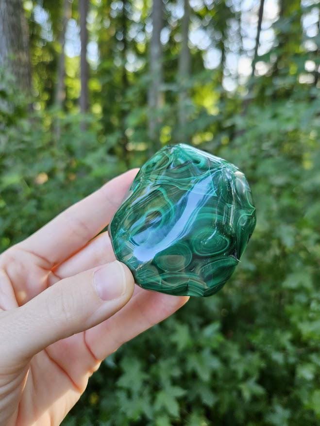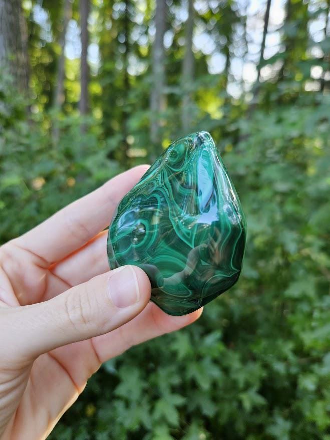 This gorgeous malachite freeform, or what some people refer to as the stone for transformation would make a great gift for someone, a lovely home decor piece, or a fantastic addition to any mineral and/or crystal collection! This is one of my go to crystals for when there is big change taking place. I like to use it while reciting positive affirmations about what is to come! <3 This polished malachite stone measures: Weight: 6.7 ounces Length: about 2.75 inches Width: about 2.5 inches *As always, please review the measurements carefully! :) The green malachite freeform you see in the pictures is the quality malachite you will receive. Thank you so much for visiting my shop! <3