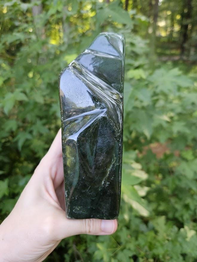 This is an absolutely stunning jade freeform from Afghanistan! It is a lovely piece with its natural jade coloring! It is beautifully polished and just a nice quality piece. You can see that this green jade stone has a nice shape and can stand on its own. I love the bits of depth that can be seen – it’s so pretty! 🙂