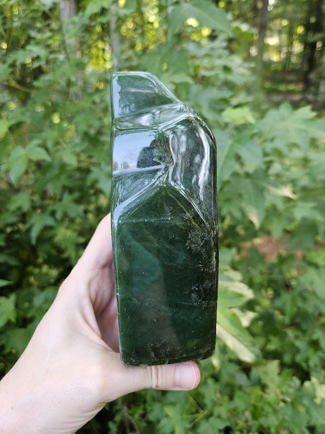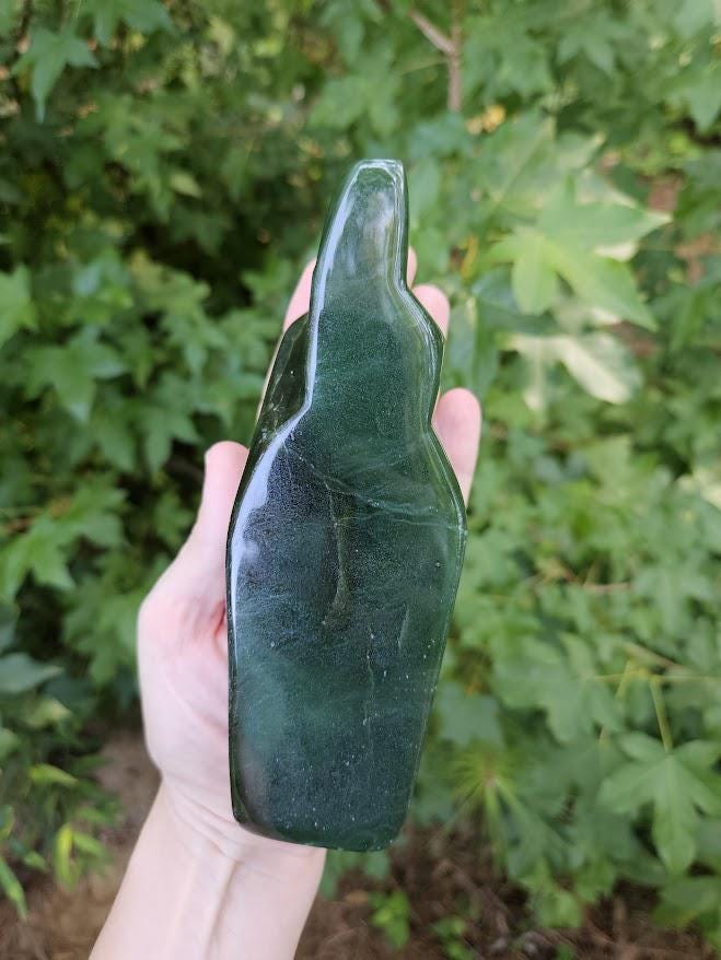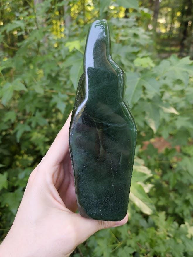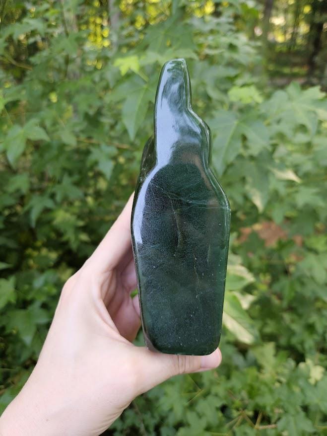 This jade stone, or what some people refer to as the stone for harmony or the abundance stone, would make a great gift for someone or would be a beautiful addition to any crystal or stone collection! Jade is one of the top stones for Taurus, Libra, Gemini, and Aries! <3 This green jade freeform measures: Weight: 1 pound 11.5 ounces Width: about 2 inches at its widest Height: about 6 inches *As always, please review the measurements carefully! :) **Be sure to check out all of our freeforms here: https://www.etsy.com/shop/MoonlightGemsAZ?ref=seller-platform-mcnav§ion_id=35940379 The nephrite jade stone you see in the pictures is the quality jade freeform you will receive. Thank you so much for visiting my shop! <3
