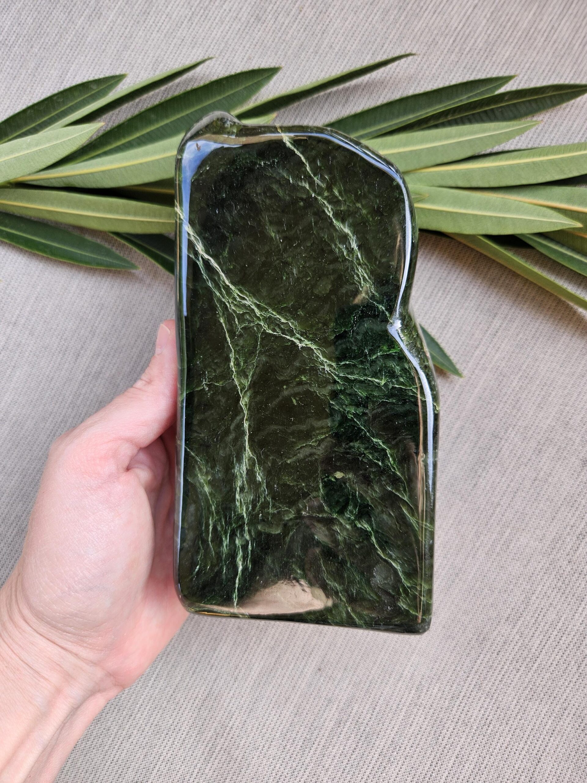 This is an absolutely stunning quality jade freeform from Afghanistan! It is a lovely piece with its natural jade coloring! It is beautifully polished and just a nice quality piece overall. You can see that this green jade stone has a nice shape and can stand on its own (horizontally). I love the bits of depth that can be seen – it’s so pretty, and it’s nice and solid! 🙂