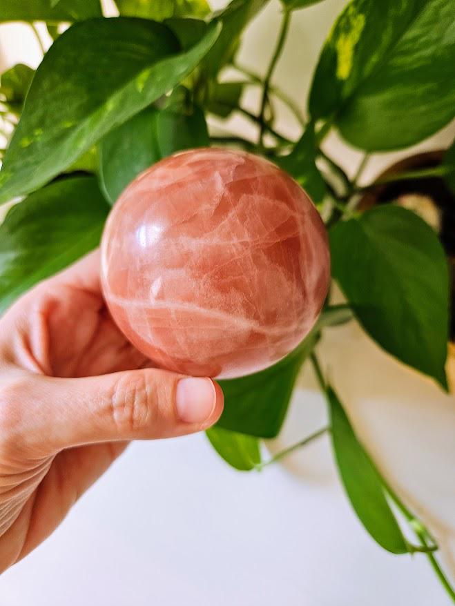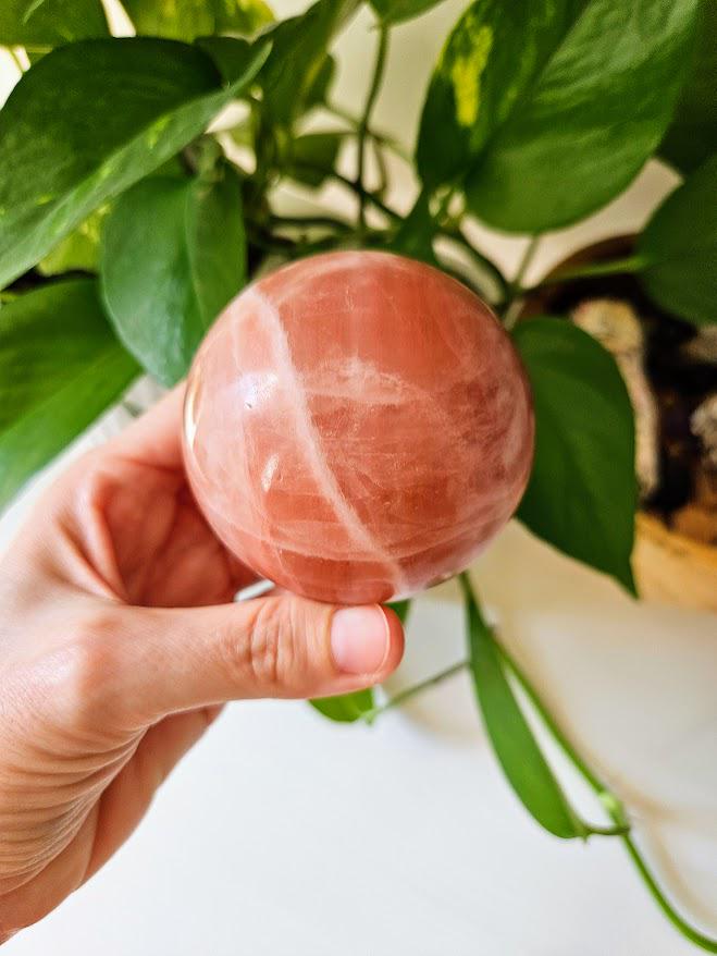 This is an absolutely gorgeous Rose Calcite sphere from Afghanistan! 🌸 The soft pink tones of this crystal are so soothing and heart-opening — it is such a beautiful and unique piece to add to your collection. The natural color and markings make it so pretty!