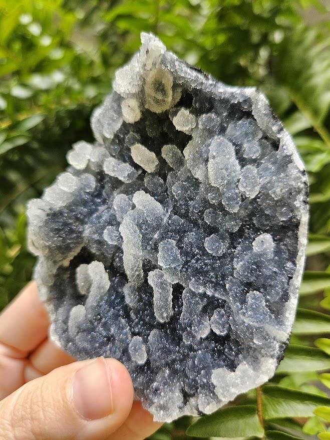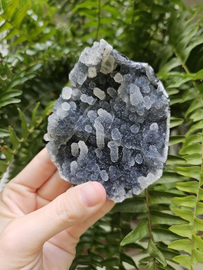 This is a gorgeous blue chalcedony cluster from Nasik, India! It has a stunning, natural grayish blue coloring throughout and such a neat appearance and texture! Blue chalcedony is rarely found and is wonderful to come by! The sparkle under bright light is so pretty! 🙂