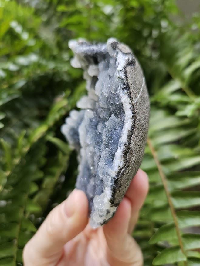This beautiful chalcedony crystal would make a great gift for someone, a lovely home decor crystal, or would be a wonderful addition to any crystal collection! <3 This raw blue chalcedony cluster measures: Weight: 8.3 ounces Width across: 3 inches Length: about 3.25 inches *As always, please review the measurements carefully! :) ** Please know that the blue coloring may vary depending on the lighting. It can appear both blue as well as gray. Please also know that since this is a raw crystal, not all the crystals will be in perfect condition. This blue chalcedony cluster that you see in the pictures, is the exact piece you will receive. Thank you so much for visiting my shop!