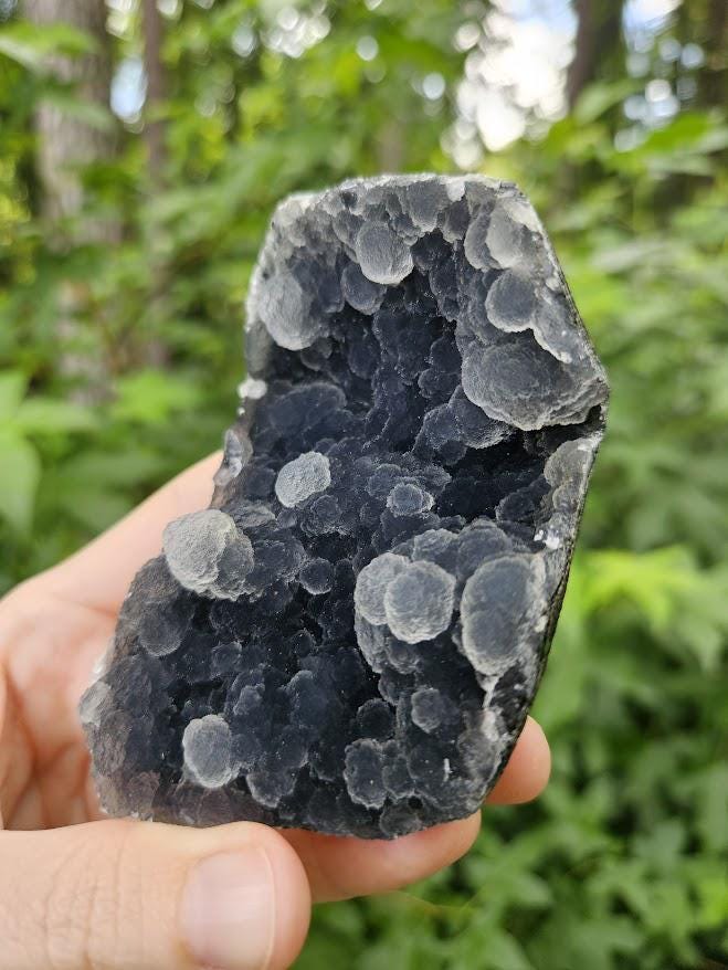 This is an absolutely stunning chalcedony cluster from India! Wow, the natural chalcedony formations and the color are gorgeous! This beautiful crystal has a gorgeous sparkle and is of beautiful quality! I love the botryoidal look as well! At times, it can look like a blackish color and even a grayish blue. 🙂