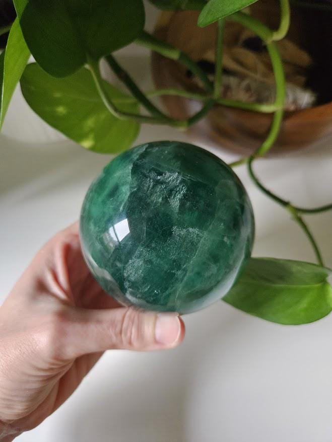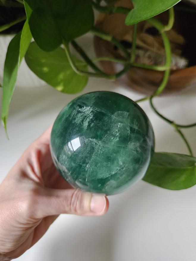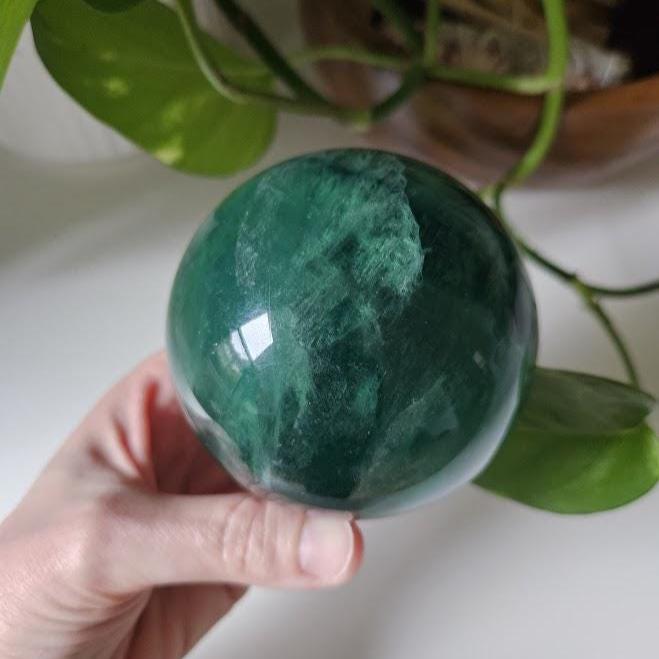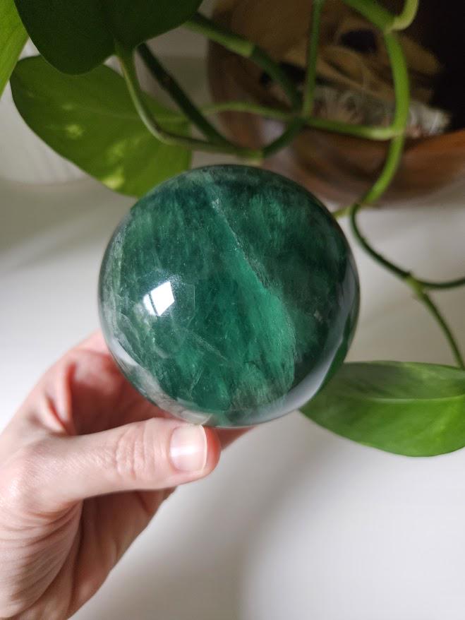 This is a beautiful, quality Green Fluorite sphere from China! It has a lovely dark green coloring with gorgeous depth and natural variation throughout. The polish is smooth, and the sphere has a rich, calming presence. This is a nice, larger size with excellent quality. I just love this piece! 🙂