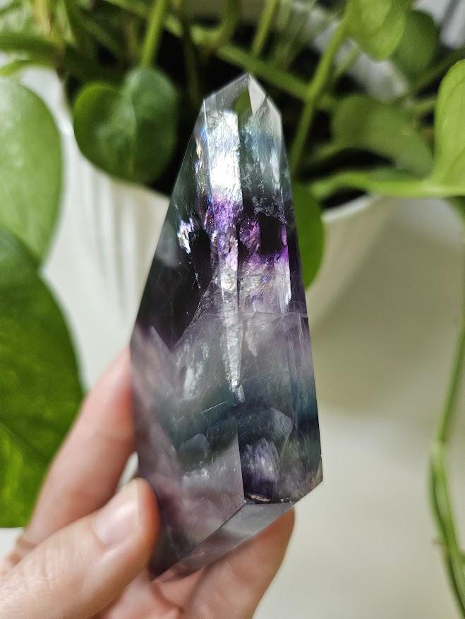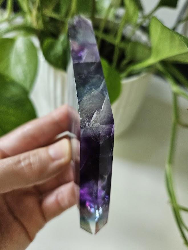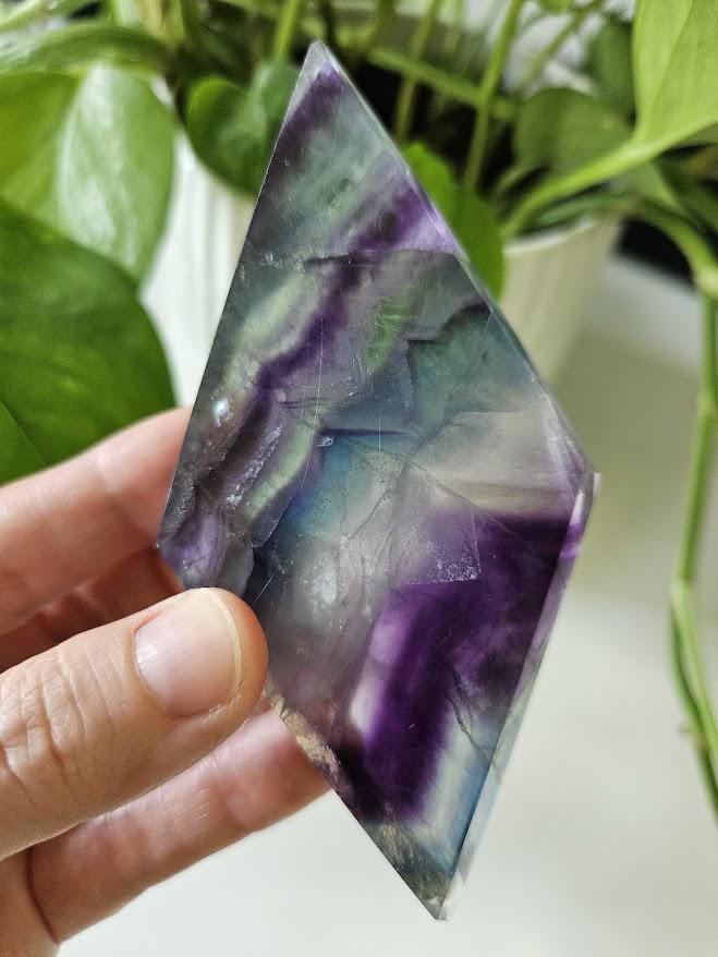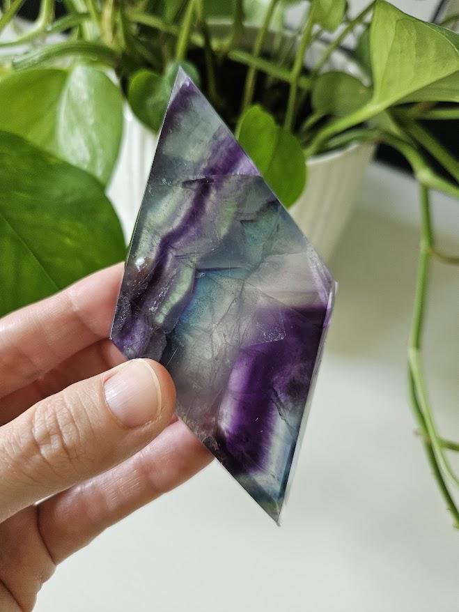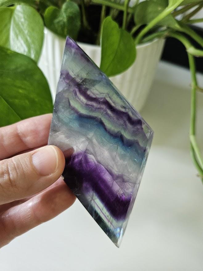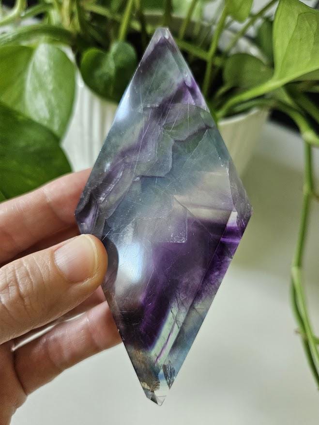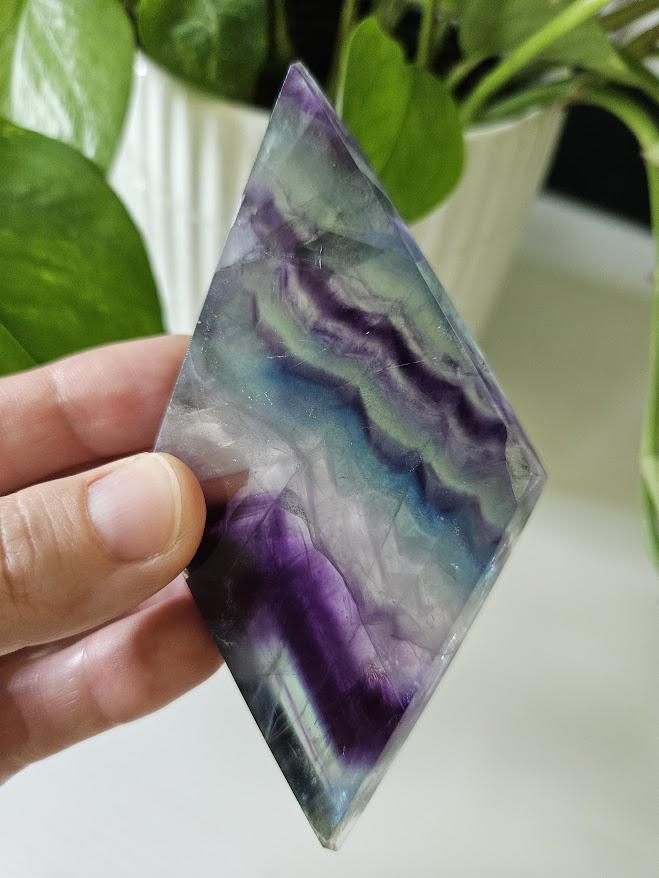 This beautiful rainbow fluorite crystal, or what some people refer to as the crystal for inner peace, would make a gorgeous home décor item, a great gift for someone, or would be a wonderful addition to any crystal collection! <3 This quality rainbow fluorite crystal measures: Weight: 4.7 ounces Height: about 4.5 inches Width: about 2.25 inches *As always, please review the measurements carefully! :) The rainbow fluorite diamond you see in the pictures is the rainbow fluorite crystal you will receive. Thank you so much for visiting my shop! <3