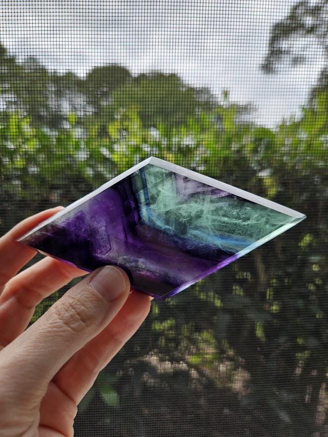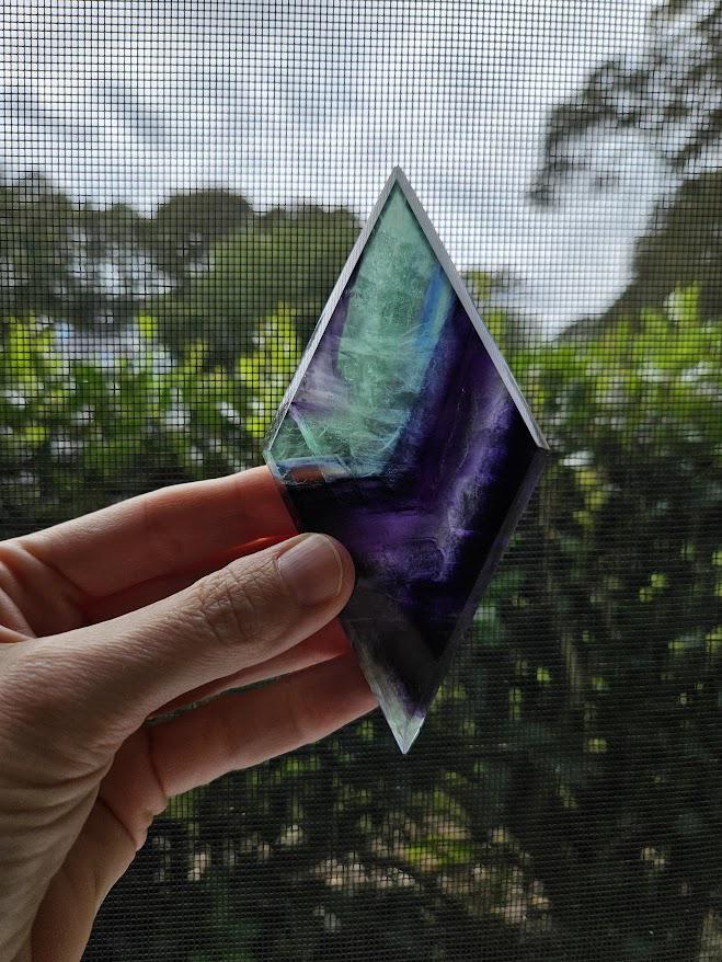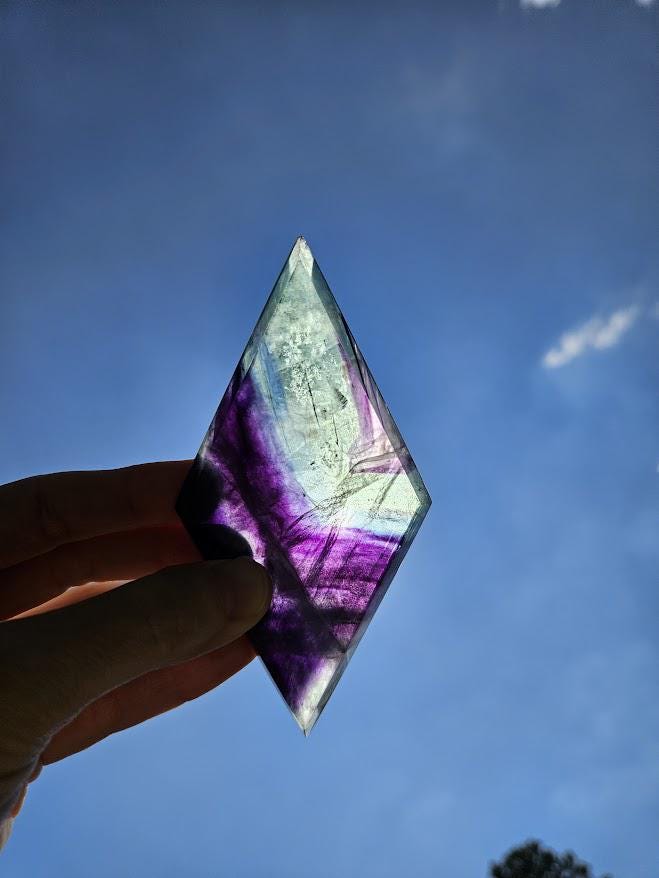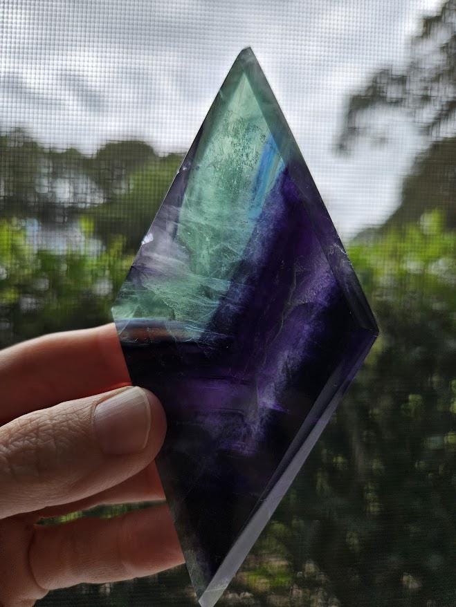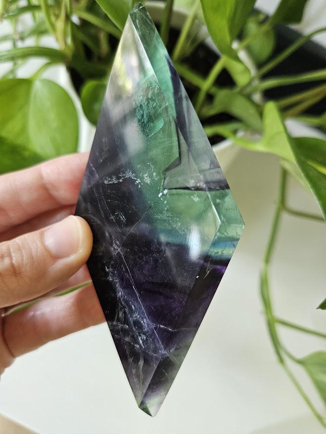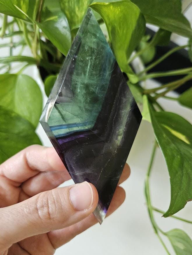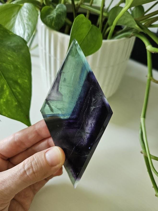 This beautiful rainbow fluorite crystal, or what some people refer to as the crystal for inner peace, would make a gorgeous home décor item, a great gift for someone, or would be a wonderful addition to any crystal collection! <3 This quality rainbow fluorite crystal measures: Weight: 4.4 ounces Height: about 4.75 inches Width: about 2.25 inches *As always, please review the measurements carefully! :) The rainbow fluorite diamond you see in the pictures is the rainbow fluorite crystal you will receive. Thank you so much for visiting my shop! <3