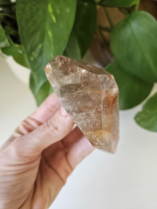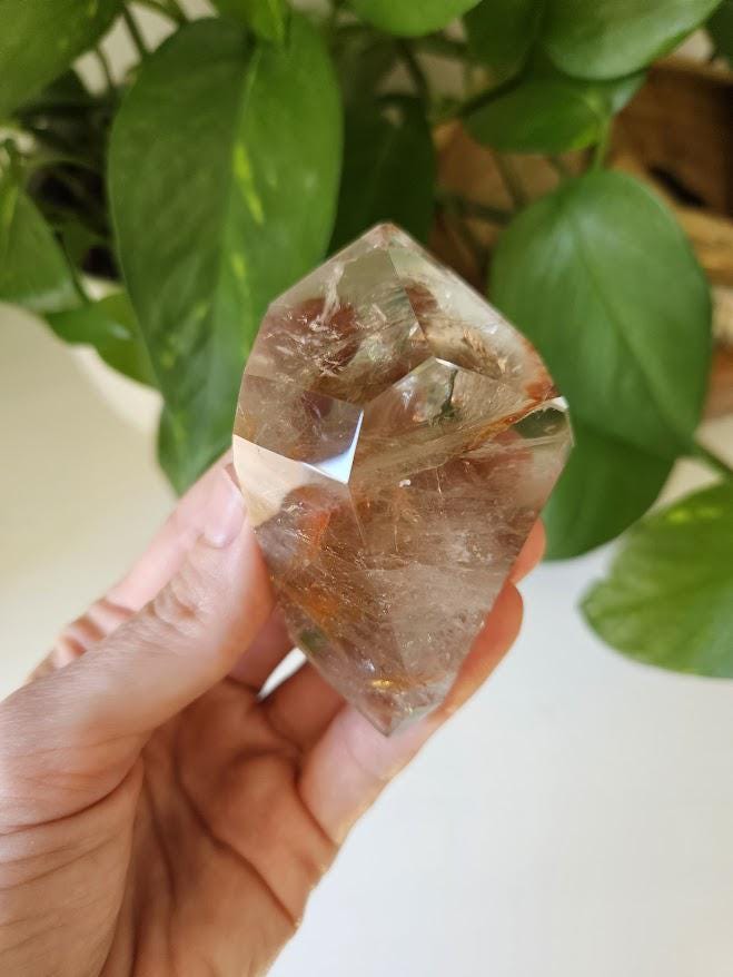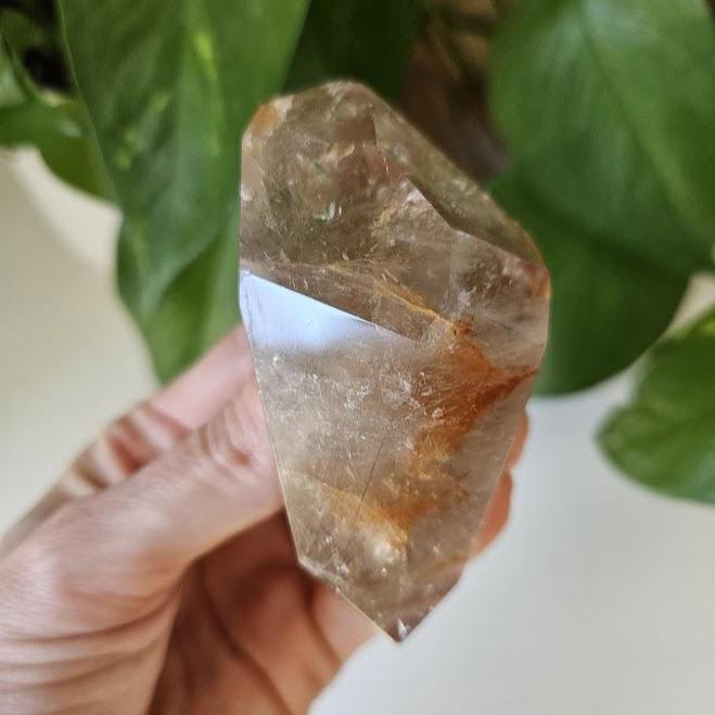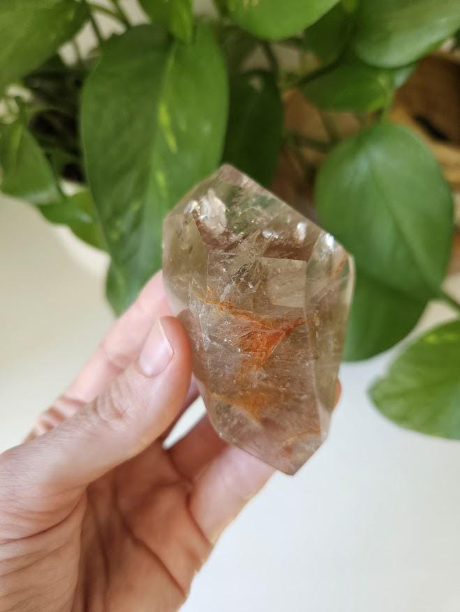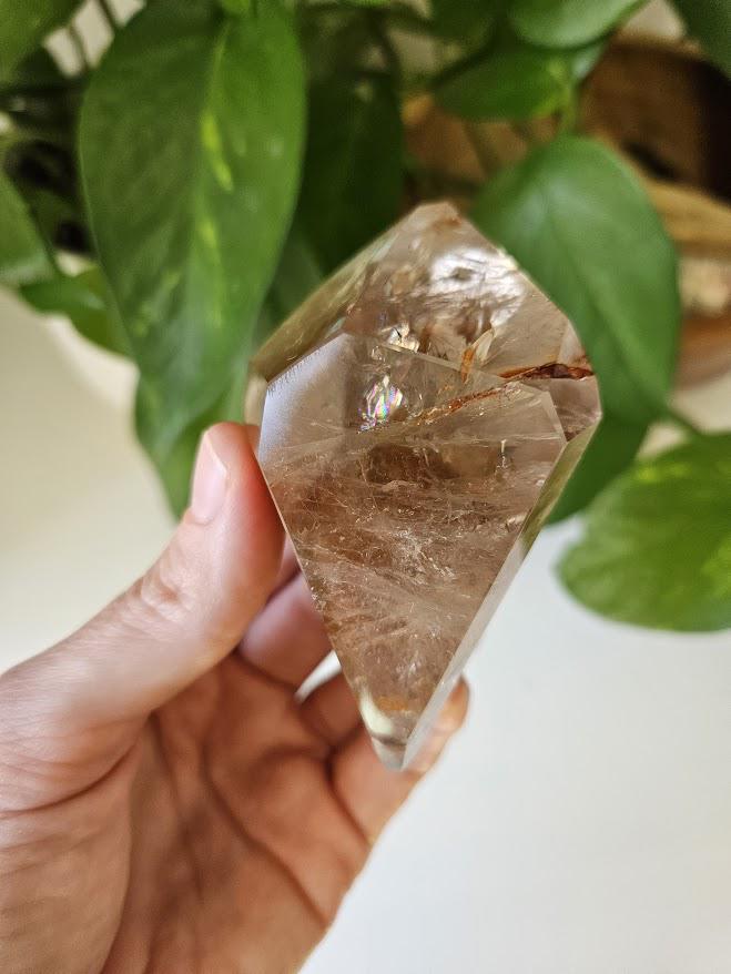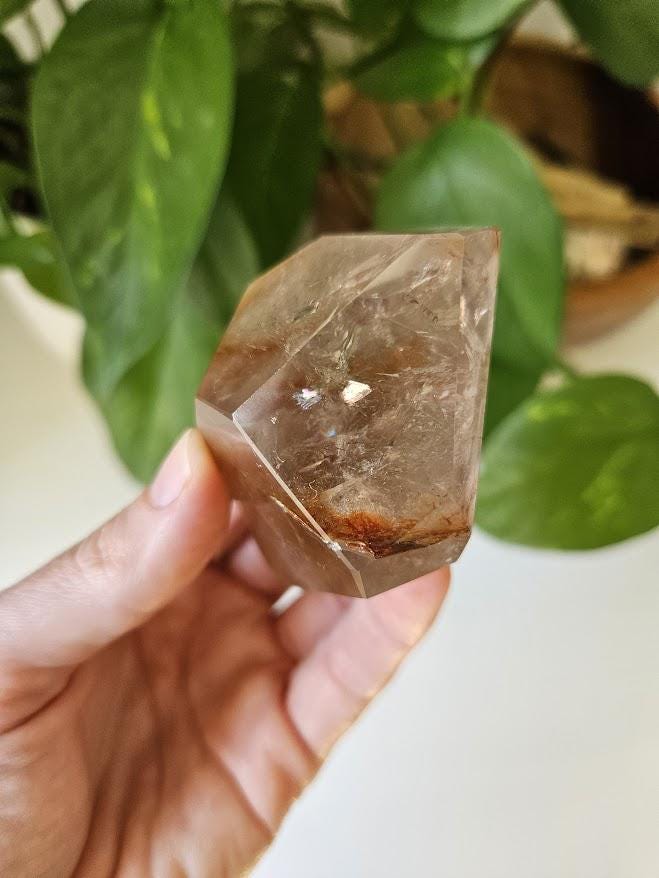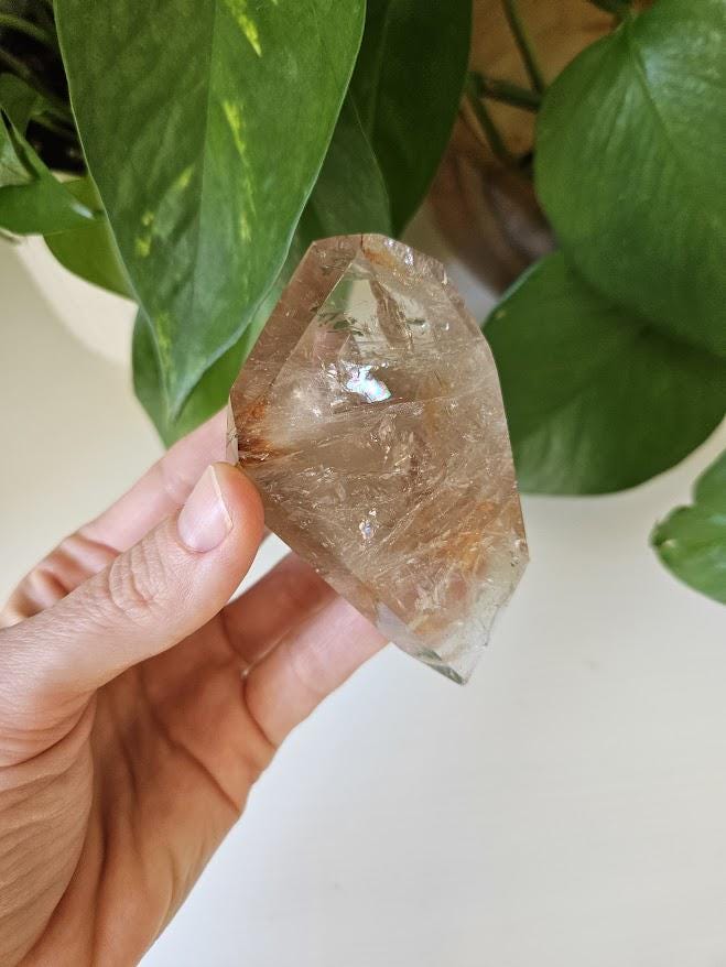 This piece has some lovely depth and clarity, and is a nice solid piece to hold. I just love the rainbows! The subtle natural smoky tones mixed with red internal patterns make it both a visually beautiful and energetically balanced specimen — perfect for display, meditation, or collection.