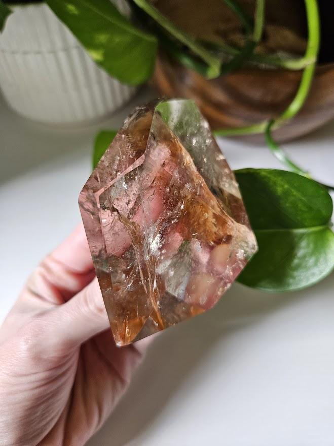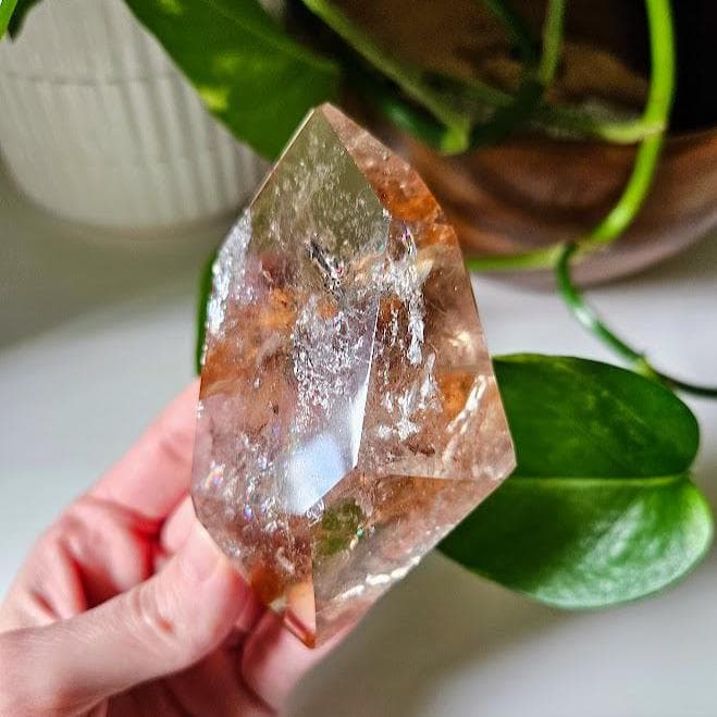 This piece has some lovely depth and clarity, and is a nice solid piece to hold. I just love the rainbows! The subtle natural smoky tones mixed with red internal patterns make it both a visually beautiful and energetically balanced specimen — perfect for display, meditation, or a collection.
