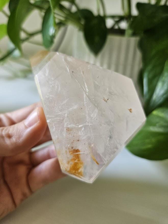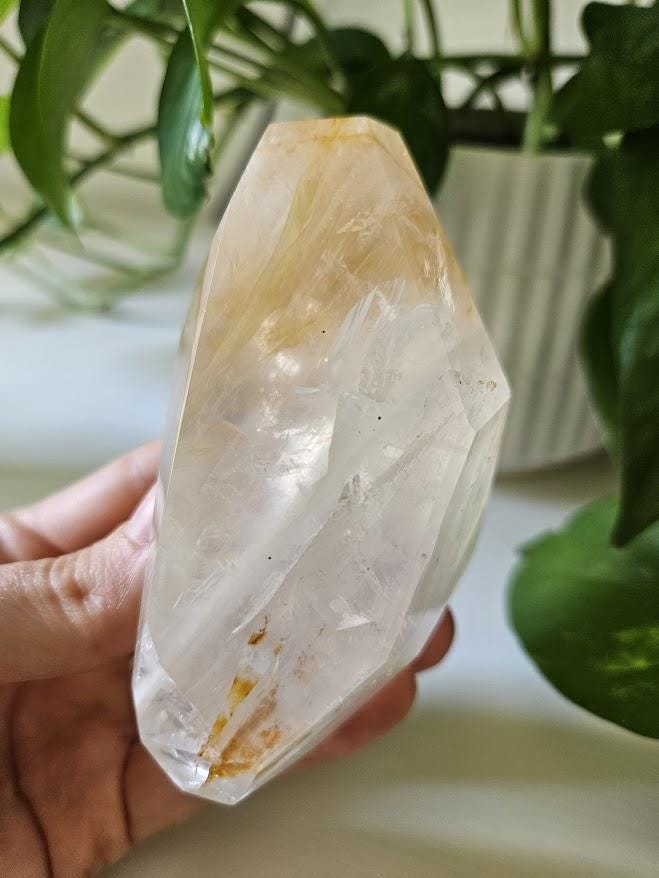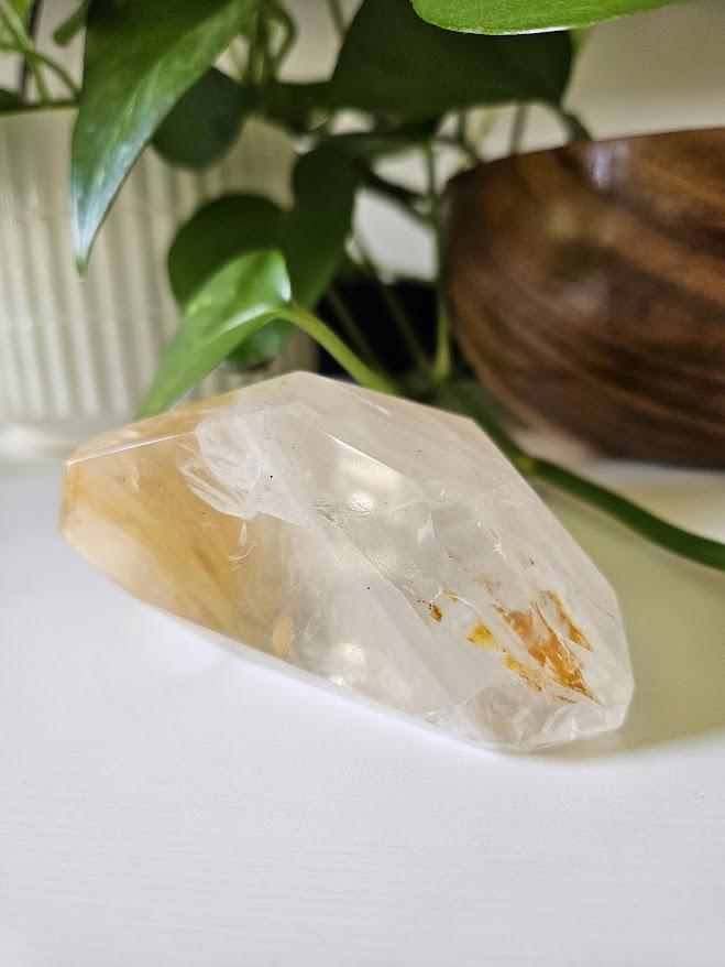 This stunning yellow hematoid quartz freeform is a high-quality piece from Bahia, Brazil. Its natural golden-yellow hues are completely genuine, showcasing the beautiful balance of clarity and warmth that this crystal is known for. The surface is polished to highlight its natural tones and inner depth while maintaining the unique character of the crystal.