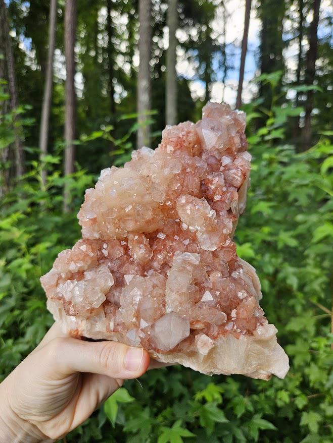 Wow! This is an absolutely stunning raw apophyllite crystal with peach stilbite! This lovely cluster originates from Nashik, India. This is a high quality crystal with gorgeous sparkle, beautiful combinations, and a stunning color! It is so rare that I can find this combination! It’s one of my favorites of all time! It has a lovely red apophyllite coloring on a beautiful bed of peach stilbite. It’s so pretty! 🙂