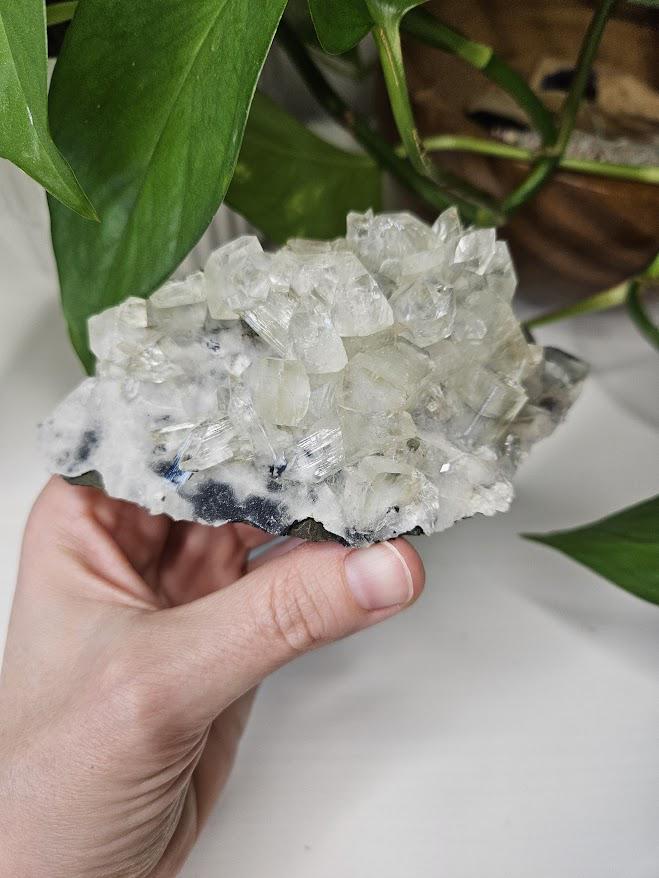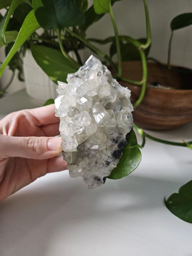 This is a beautiful diamond Apophyllite crystal cluster from India! I just love this piece and love the fact that it displays nicely on its own! It features gorgeous, naturally formed Apophyllite crystals with a touch of blue and white chalcedony beneath them. This is a lovely crystal cluster!